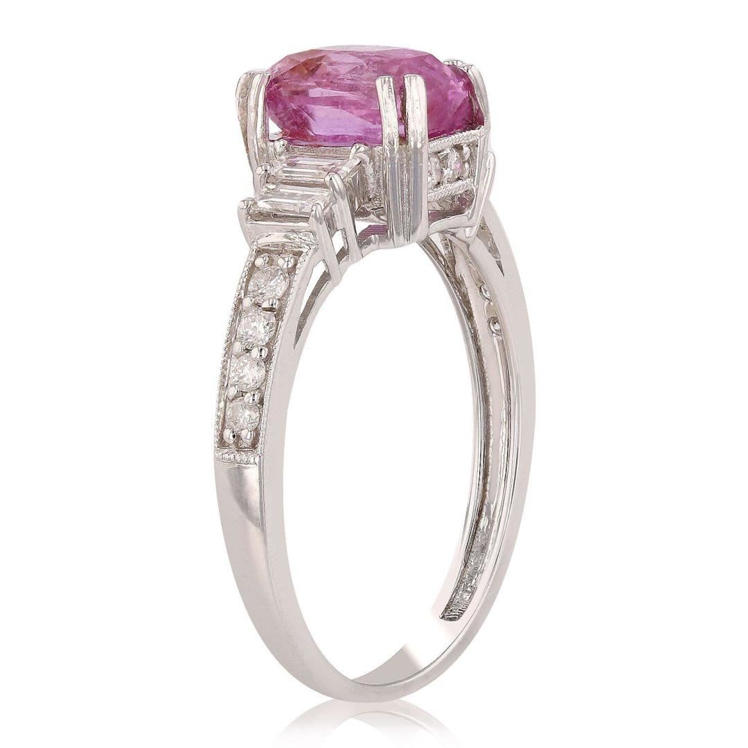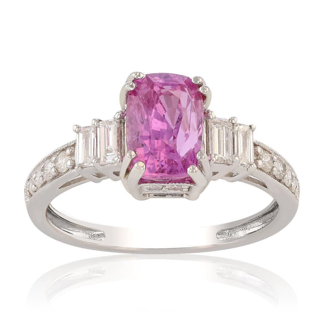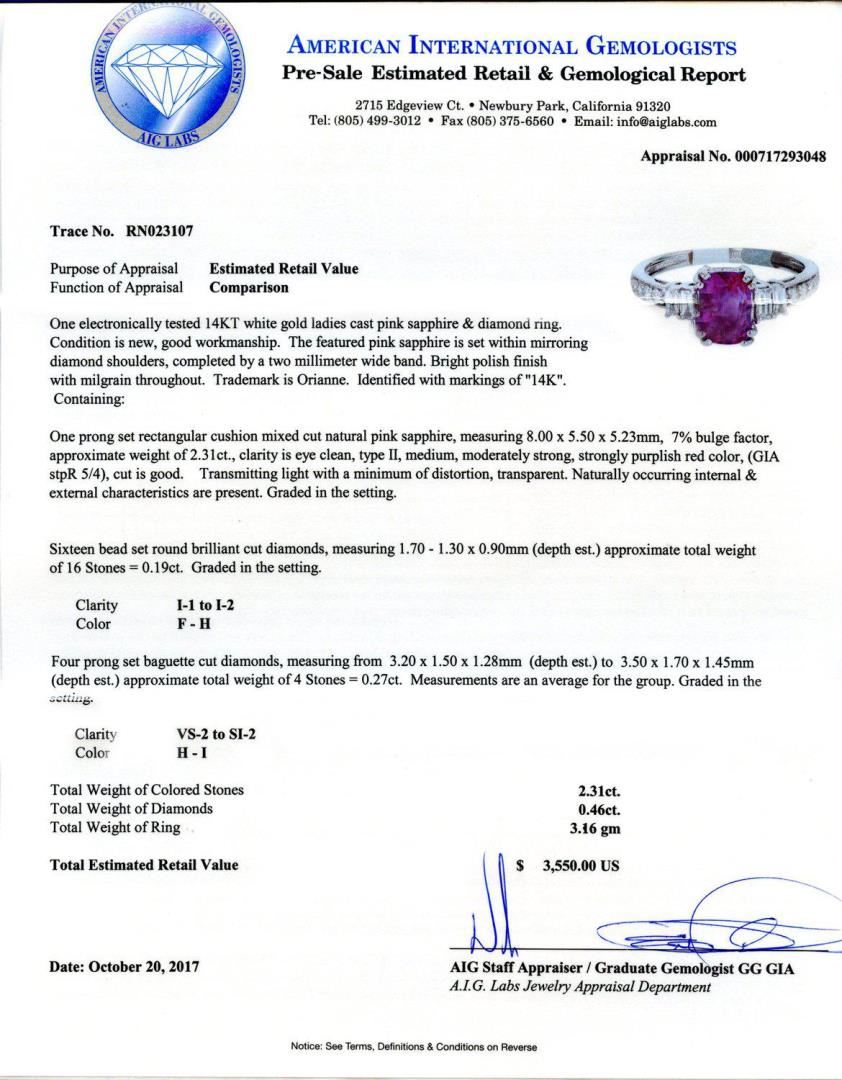 One electronically tested 14KT white gold ladies cast pink sapphire and diamond ring. Condition is new, good workmanship. The featured pink sapphire is set within mirroring diamond shoulders, completed by a two millimeter wide band. Bright polish finish with Mil grain throughout. Trademark is Orianne. Identified with markings of "14K". Containing: One prong set rectangular cushion mixed cut natural pink sapphire, measuring 8.00 x 5.50 x 5.23mm, 7% bulge factor, approximate weight of 2.31ct., clarity is eye clean, type II, medium, moderately strong, strongly purplish red color, (GIA stpR 5/4), cut is good. Transmitting light with a minimum of distortion, transparent. Naturally occurring internal and external characteristics are present. Graded in the setting. Sixteen bead set round brilliant cut diamonds, measuring 1.70 - 1.30 x 0.90mm (depth est.) approximate total weight of 16 Stones = 0.19ct. Graded in the setting. Clarity 1-1 to 1-2 Color F - H Four prong set baguette cut diamonds, measuring from 3.20 x 1.50 x 1.28mm (depth est.) to 3.50 x 1.70 x 1.45mm (depth est.) approximate total weight of 4 Stones = 0.27ct. Measurements are an average for the group. Graded in the setting. Clarity VS-2 to SI-2 Color H - I Total Weight of Colored Stones 2.31ct. Total Weight of Diamonds 0.46ct. Total Weight of Ring 3.16 gm