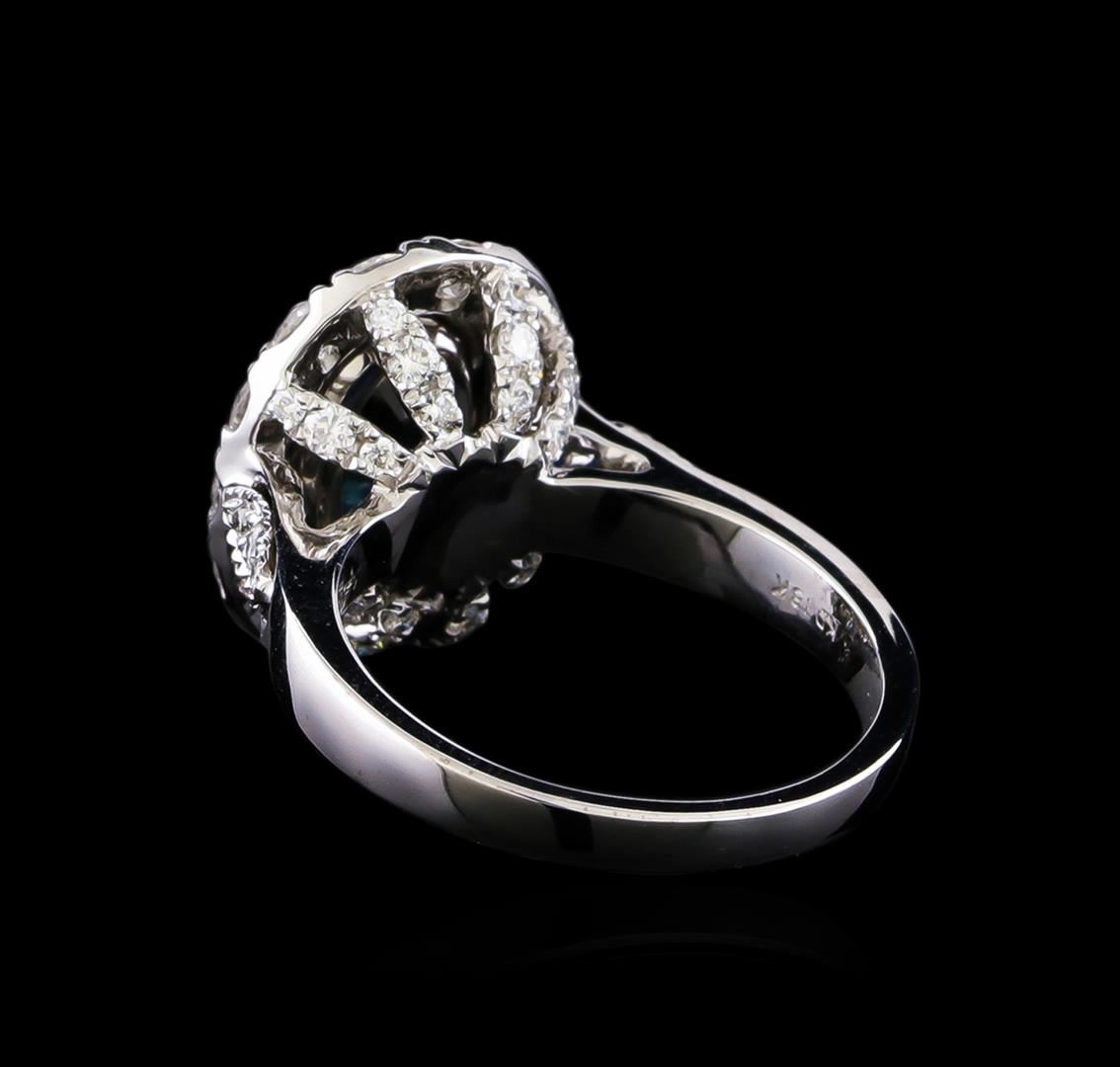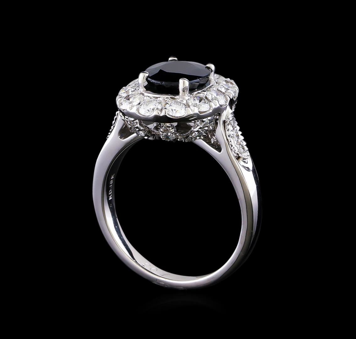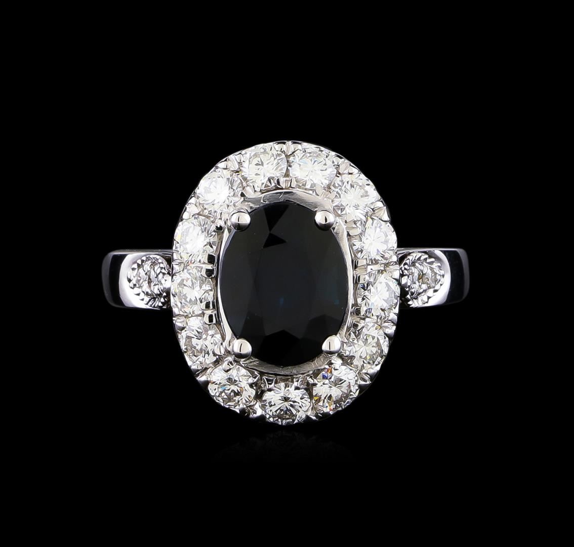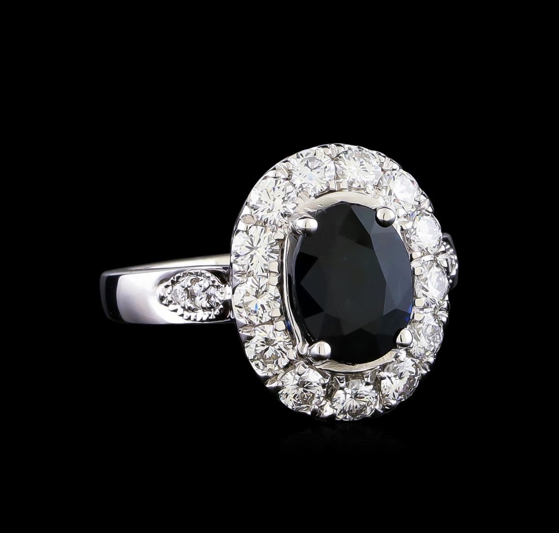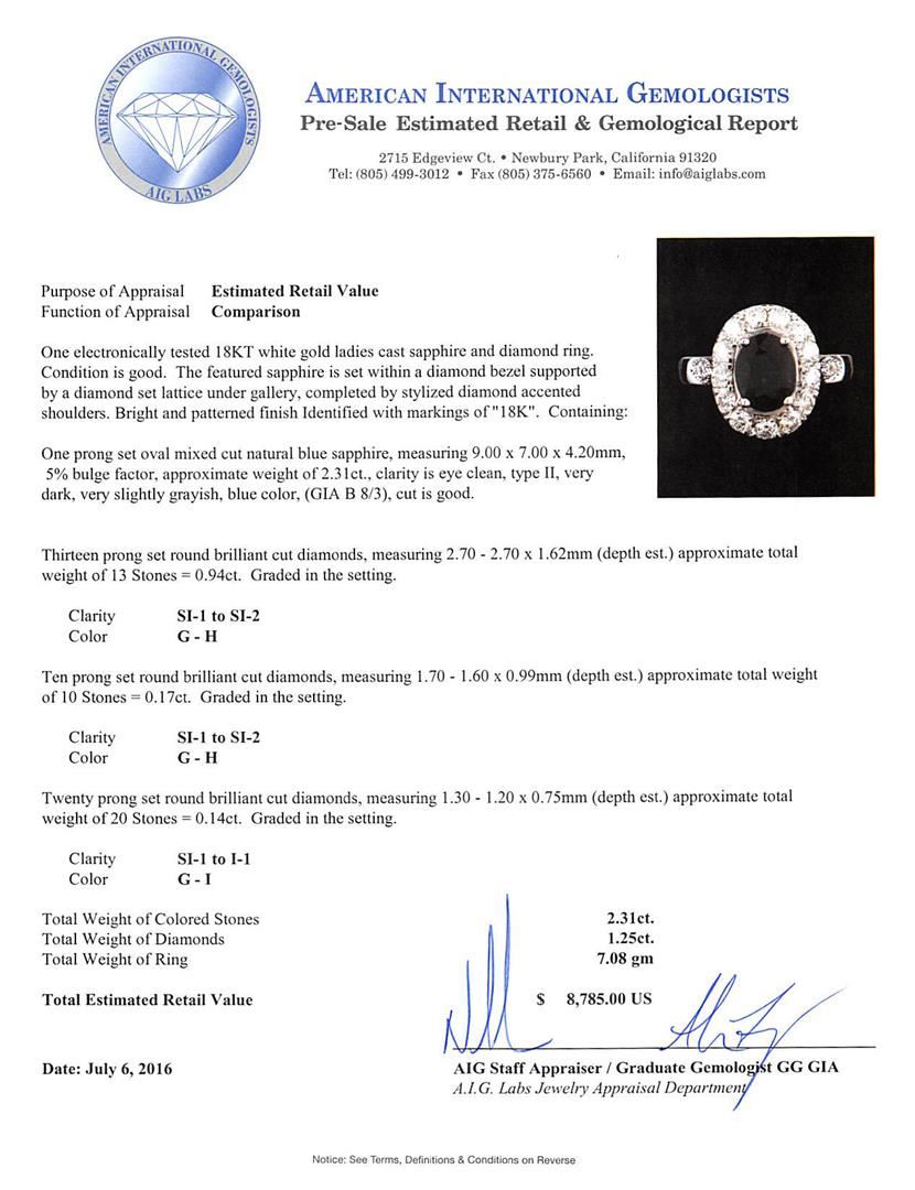 One electronically tested 18KT white gold ladies cast sapphire and diamond ring. The featured sapphire is set within a diamond bezel supported by a diamond set lattice under gallery, completed by stylized diamond accented shoulders. Bright and patterned finish Identified with markings of "18K". Condition is good. Containing: One prong set oval mixed cut natural blue sapphire, measuring 9.00 x 7.00 x 4.20mm, 5%. bulge factor, approximate weight of 2.31ct., clarity is eye clean, type II, very dark, very slightly grayish, blue color, (GIA B 8/3), cut is good. Thirteen prong set round brilliant cut diamonds, measuring 2.70 - 2.70 x 1.62mm (depth est.) approximate total weight of 13 Stones = 0.94ct. Graded in the setting. Clarity: SI-1 to SI-2. Color: G - H Ten prong set round brilliant cut diamonds, measuring 1.70 - 1.60 x 0.99mm (depth est.) approximate total weight of 10 Stones = 0.17ct. Graded in the setting. Clarity: SI-1 to SI-2. Color: G - H Twenty prong set round brilliant cut diamonds, measuring 1.30 - 1.20 x 0.75mm (depth est.) approximate total weight of 20 Stones = 0.14ct. Graded in the setting. Clarity: SI-1 to I-1. Color: G - I. Total Weight of Colored Stones 2.31ct. Total Weight of Diamonds 1.25ct. Total Weight of Ring 7.08gm. AIG Appraised at $8,785.00.