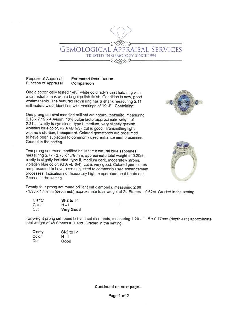 One electronically tested 14KT white gold lady's cast halo ring with a cathedral shank with a bright polish finish. The featured lady's ring has a shank measuring 2.11 millimeters wide. Identified with markings of "K14". Condition is new, good workmanship. Containing: One prong set oval modified brilliant cut natural tanzanite, measuring 9.18 x 7.15 x 4.44mm, 10% bulge factor, approximate weight of 2.31ct., clarity is eye clean, type I, medium, very slightly grayish, violetish blue color, (GIA vB 5/3), cut is good. Transmitting light with no distortion, transparent. Colored gemstones are presumed to have been subjected to commonly used enhancement processes. Graded in the setting. Two prong set round modified brilliant cut natural blue sapphires, measuring 2.77 - 2.75 x 1.79 mm, approximate total weight of 0.20ct., clarity is slightly included, type II, medium dark, moderately strong, violetish blue color, (GIA vB 6/4), cut is very good. Colored gemstones are presumed to have been subjected to commonly used enhancement processes. Indications of laboratory high temperature heat treatment. Graded in the setting. Twenty-Four prong set round brilliant cut diamonds, measuring 2.00 - 1.90 x 1.17mm (depth est.) approximate total weight of 24 Stones = 0.62ct. Graded in the setting. Clarity: SI-2 to I-1. Color: H - I. Cut Very Good Forty-Eight prong set round brilliant cut diamonds, measuring 1.20 - 1.15 x 0.77mm (depth est.) approximate total weight of 48 Stones = 0.32ct. Graded in the setting. Clarity: SI-2 to I-1. Color: H - I. Cut Good. Total Weight of Colored Stones 2.51ct. Total Weight of Diamonds 0.94ct. Total Weight of Ring 5.00gm. GAS Appraised at $6,615.00.