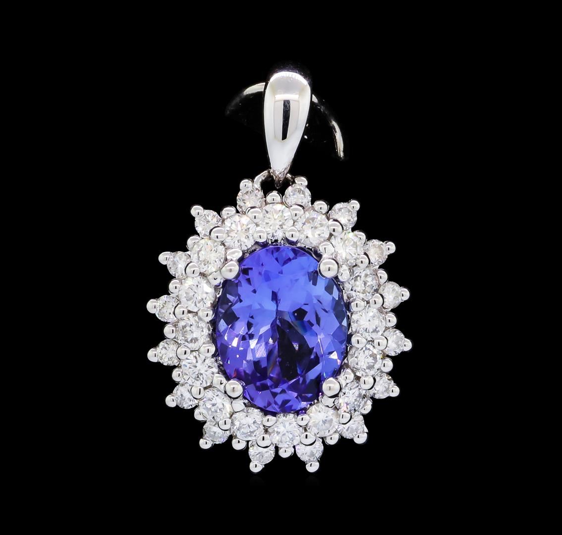 One electronically tested 18KT white gold ladies cast tanzanite and diamond pendant. The pendant features a tanzanite set within a tiered diamond floret bezel, completed by a white gold bail. Bright polish finish. Identified with markings of '750'. Condition is good. Containing: One prong set oval mixed cut natural tanzanite, measuring 9.39 x 7.40 x 4.58mm, approximate weight of 2.31ct., clarity is eye clean, type I, medium, very slightly grayish, bluish violet color, (GIA bV 5/3), cut is good. Transmitting light with no distortion, transparent. Graded in the setting.Tanzanite is a very rare gemstone that is only found in the country of Tanzania. Originally discovered in 1967. Tiffany & Company, named the stone Tanzanite. It is found in the Usumburu Mountains that border the Umba Valley of northern Tanzania. Tanzanite occurs in gray, brown, violet, blue, reddish-purple, & green. The gem is interesting because of its exceptional pleochroism. Rotated in different directions a tanzanite will exhibit multiple changes of color. Tanzanite has a low tolerance to ultrasonic cleaning, and should not be cleaned using this method. Thirty-Two prong set round brilliant cut diamonds, measuring 2.00 - 1.60 x 1.08mm (depth est.) approximate total weight of 32 Stones = 0.81ct. Graded in the setting. Clarity SI-1 to I-1. Color: F - H. Total Weight of Colored Stones 2.31ct.. Total Weight of Diamonds 0.81ct.. Total Weight of Pendant 4.06gm. AIG Appraised at $7,550.00.