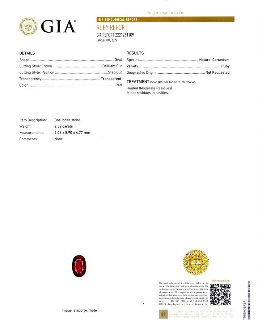 Eighteen karat (18K) two tone gold natural ruby corundum and diamond ring. An oval brilliant cut natural ruby corundum gemstone is mounted in the center of the ring. Round brilliant cut diamonds accent the ring around and on both sides of the center gemstone. The ring has a gross weight of 7.8 Grams. (Black Enamel Set in the Center of the Ring) Reference: GIA Ruby Report #2221261109 #NATURAL GEMSTONE# GEMSTONE: Ruby Corundum NATURE: Natural SHAPE: Oval Brilliant, Faceted Cut WEIGHT: 2.32 carat total DIMENSIONS: 9.06 x 5.90 x 4.77mm CLARITY: Type 3 COLOR: Red (5/5) SYMMETRY: Excellent COLOR INTENSITY: Intense TRANSPARENCY: Transparent TONE: Dark #NATURAL DIAMOND# SHAPE: Round Brilliant Cut WEIGHT: 0.86 carat total (28pcs.) DIMENSIONS: 2.1 x 2.0mm AVERAGE CLARITY: SI2-I1 AVERAGE COLOR: G-H SYMMETRY: Excellent POLISH: Excellent #METAL# METAL: Gold PURITY: 18K (750) COLOR: Two Tone (Yellow and White) CONDITION: Excellent FINISH: High Polish