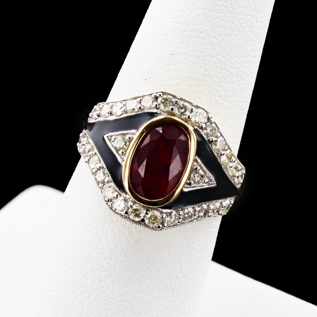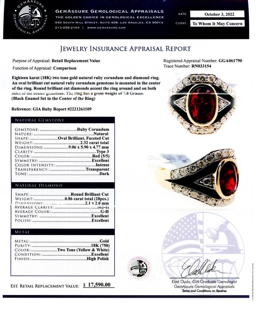 Eighteen karat (18K) two tone gold natural ruby corundum and diamond ring. An oval brilliant cut natural ruby corundum gemstone is mounted in the center of the ring. Round brilliant cut diamonds accent the ring around and on both sides of the center gemstone. The ring has a gross weight of 7.8 Grams. (Black Enamel Set in the Center of the Ring) Reference: GIA Ruby Report #2221261109 #NATURAL GEMSTONE# GEMSTONE: Ruby Corundum NATURE: Natural SHAPE: Oval Brilliant, Faceted Cut WEIGHT: 2.32 carat total DIMENSIONS: 9.06 x 5.90 x 4.77mm CLARITY: Type 3 COLOR: Red (5/5) SYMMETRY: Excellent COLOR INTENSITY: Intense TRANSPARENCY: Transparent TONE: Dark #NATURAL DIAMOND# SHAPE: Round Brilliant Cut WEIGHT: 0.86 carat total (28pcs.) DIMENSIONS: 2.1 x 2.0mm AVERAGE CLARITY: SI2-I1 AVERAGE COLOR: G-H SYMMETRY: Excellent POLISH: Excellent #METAL# METAL: Gold PURITY: 18K (750) COLOR: Two Tone (Yellow and White) CONDITION: Excellent FINISH: High Polish Size: 7