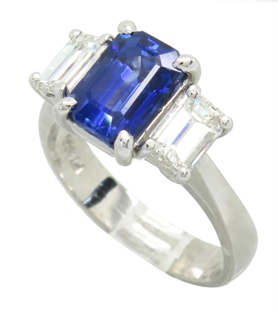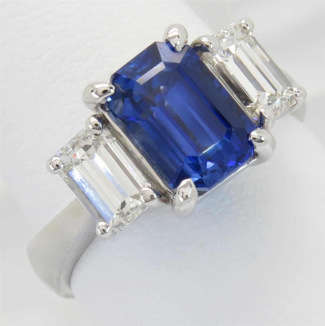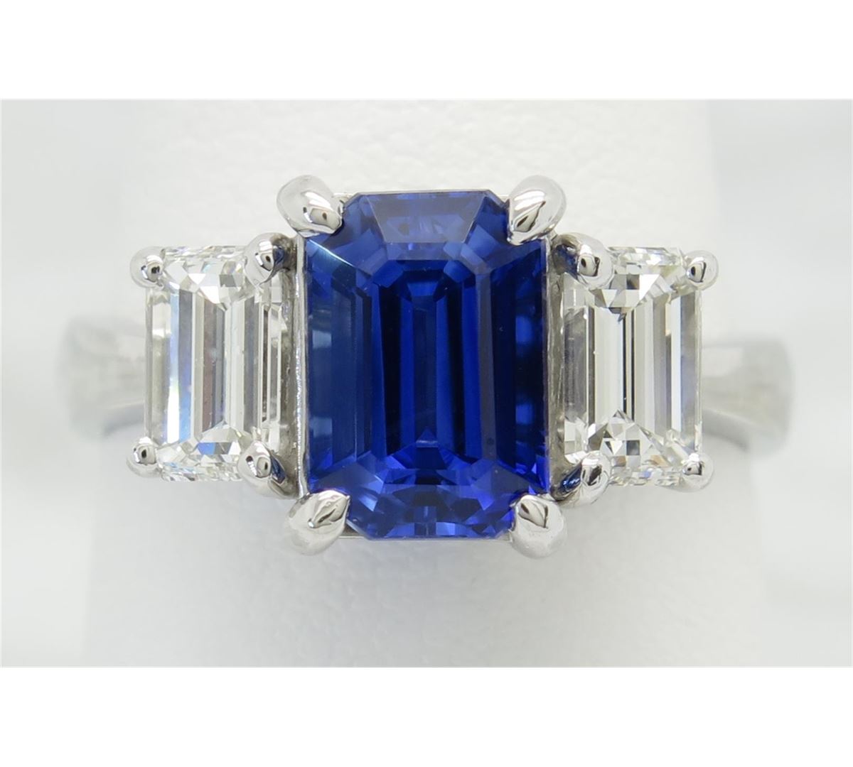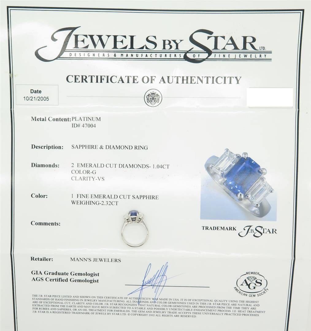 One tested platinum designer JB Star diamond and sapphire ring. Containing: One Emerald Cut Sapphire. Approximate size: 2.32CT. Two Emerald Cut Diamonds. Clarity: VS, Color: G. Approximate total diamond weight: 1.04CTW. All diamonds are graded in the mounting unless otherwise stated. Weight of ring: 7.6 grams, Size: 5.5.