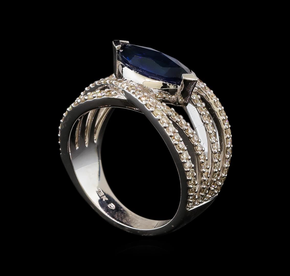 One electronically tested 18KT white gold lady's cast fashion ring with a crossover split shank with a bright polish finish. The featured lady's ring has a shank measuring 4.02 millimeters wide. Identified with markings of '18K'. Condition is new, good workmanship. Containing: One prong set marquise modified brilliant cut natural blue sapphire, measuring 12.50 x 6.00 x 3.75mm, (depth est.) 3%. bulge factor, approximate weight of 2.33ct., clarity is slightly included, medium, moderately strong, blue color, (GIA B 5/4), cut is good. Transmitting light with a minimum of distortion, transparent. Colored gemstones are presumed to have been subjected to commonly used enhancement processes. Graded in the setting. One Hundred Twelve prong set round brilliant cut diamonds, measuring 1.35 - 1.25 x 0.81mm (depth est.) approximate total weight of 112 Stones = 0.92ct. Graded in the setting. Clarity VS-2 to SI-2. Color: H - J Cut Good. Total Weight of Colored Stones 2.33ct.. Total Weight of Diamonds 0.92ct.. Total Weight of Ring 10.00gm. GAS Appraised at $15,095.00.