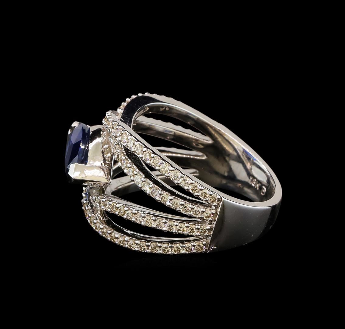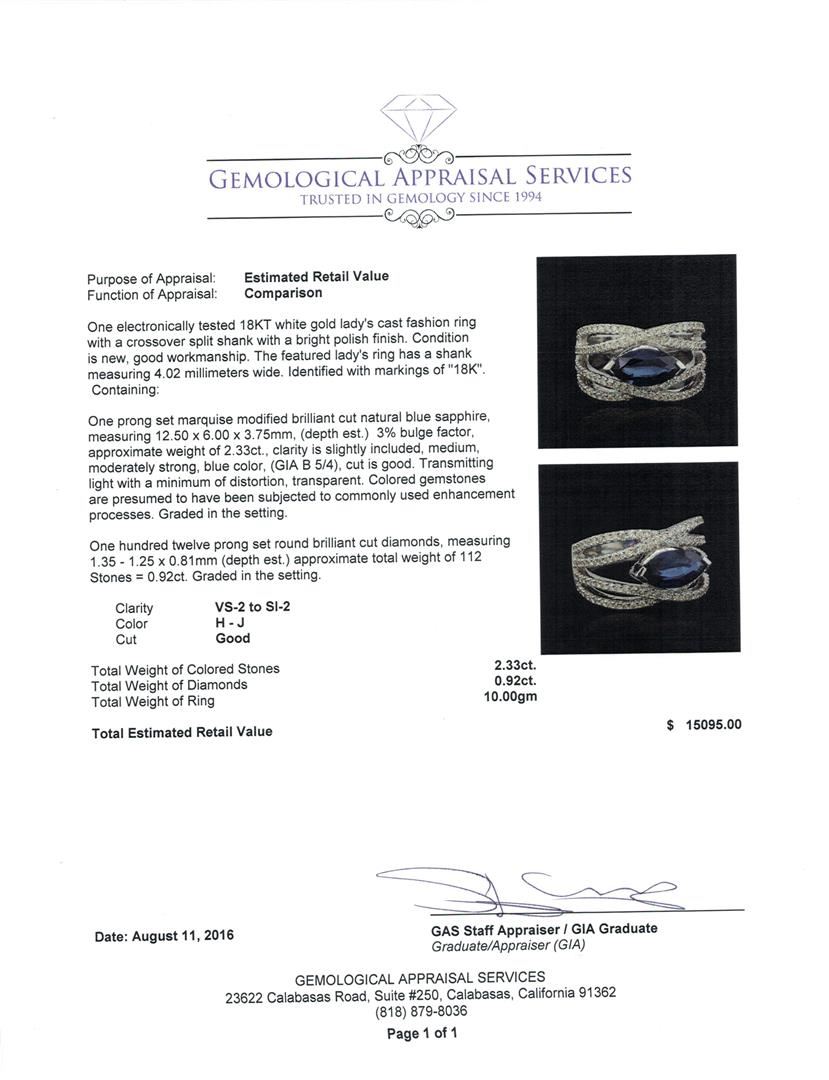 One electronically tested 18KT white gold lady's cast fashion ring with a crossover split shank with a bright polish finish. The featured lady's ring has a shank measuring 4.02 millimeters wide. Identified with markings of '18K'. Condition is new, good workmanship. Containing: One prong set marquise modified brilliant cut natural blue sapphire, measuring 12.50 x 6.00 x 3.75mm, (depth est.) 3%. bulge factor, approximate weight of 2.33ct., clarity is slightly included, medium, moderately strong, blue color, (GIA B 5/4), cut is good. Transmitting light with a minimum of distortion, transparent. Colored gemstones are presumed to have been subjected to commonly used enhancement processes. Graded in the setting. One Hundred Twelve prong set round brilliant cut diamonds, measuring 1.35 - 1.25 x 0.81mm (depth est.) approximate total weight of 112 Stones = 0.92ct. Graded in the setting. Clarity VS-2 to SI-2. Color: H - J Cut Good. Total Weight of Colored Stones 2.33ct.. Total Weight of Diamonds 0.92ct.. Total Weight of Ring 10.00gm. GAS Appraised at $15,095.00.