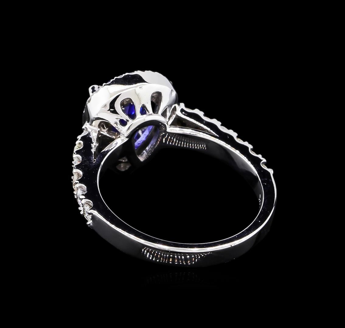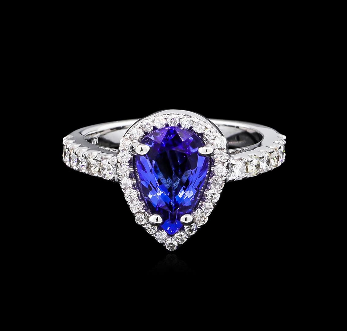 One electronically tested 14KT white gold lady's cast fashion ring with a cathedral shank with a halo with a bright polish finish. The featured lady's ring has a shank measuring 2.61 millimeters wide. Identified with markings of "14K". Condition is new, good workmanship. Containing: One prong set pear modified brilliant cut natural tanzanite, measuring 10.89 x 7.18 x 4.33mm, approximate weight of 2.33ct., clarity is eye clean, type I, medium, moderately strong, violetish blue color, (GIA vB 5/4), cut is very good. Transmitting light with no distortion, transparent. Colored gemstones are presumed to have been subjected to commonly used enhancement processes. Graded in the setting. Twelve prong set round brilliant cut diamonds, measuring 2.10 - 2.05 x 1.29mm (depth est.) approximate total weight of 12 Stones = 0.42ct. Graded in the setting. Clarity: SI-1 to I-1. Color: H - Good Twenty-Six prong set round brilliant cut diamonds, measuring 1.40 - 1.30 x 0.81mm (depth est.) approximate total weight of 26 Stones = 0.23ct. Graded in the setting. Clarity: SI-1 to I-1. Color: H - I. Cut Good. Total Weight of Colored Stones 2.33ct. Total Weight of Diamonds 0.65ct. Total Weight of Ring 6.70gm. GAS Appraised at $5,935.00.