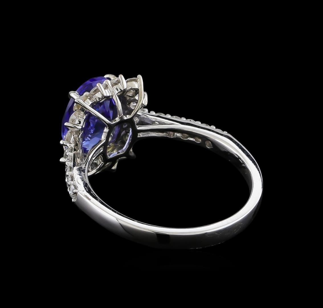 One electronically tested 14KT white gold ladies cast tanzanite and diamond ring with a bright polish finish. The featured tanzanite is set within a diamond floret bezel supported by diamond set shoulders, completed by a two millimeter wide band. Trademark is Orianne. Identified with markings of "14K". Condition is new, good workmanship. Containing: One prong set oval mixed cut natural tanzanite, measuring 9.50 x 7.45 x 4.42mm, 6%. bulge factor, approximate weight of 2.33ct., clarity is eye clean, type I, medium dark, slightly grayish, bluish violet color, (GIA bV 6/2), cut is good. Transmitting light with no distortion, transparent. Graded in the setting. Tanzanite is a very rare gemstone that is only found in the country of Tanzania. Originally discovered in 1967. Tiffany & Company, named the stone Tanzanite. It is found in the Usumburu Mountains that border the Umba Valley of northern Tanzania. Tanzanite occurs in gray, brown, violet, blue, reddish-purple, & green. The gem is interesting because of its exceptional pleochroism. Rotated in different directions a tanzanite will exhibit multiple changes of color. Tanzanite has a low tolerance to ultrasonic cleaning, and should not be cleaned using this method. Fourteen prong set round brilliant cut diamonds, measuring 2.30 - 2.20 x 1.35mm (depth est.) approximate total weight of 14 Stones = 0.68ct. Graded in the setting. Clarity: I-1 to I-2. Color: H - J Ten prong set round brilliant cut diamonds, measuring 1.60 - 1.50 x 0.93mm (depth est.) approximate total weight of 10 Stones = 0.23ct. Graded in the setting. Clarity: I-1 to I-2. Color: G - I. Total Weight of Colored Stones 2.33ct. Total Weight of Diamonds 0.91ct. Total Weight of Ring 3.32gm. AIG Appraised at $6,690.00.