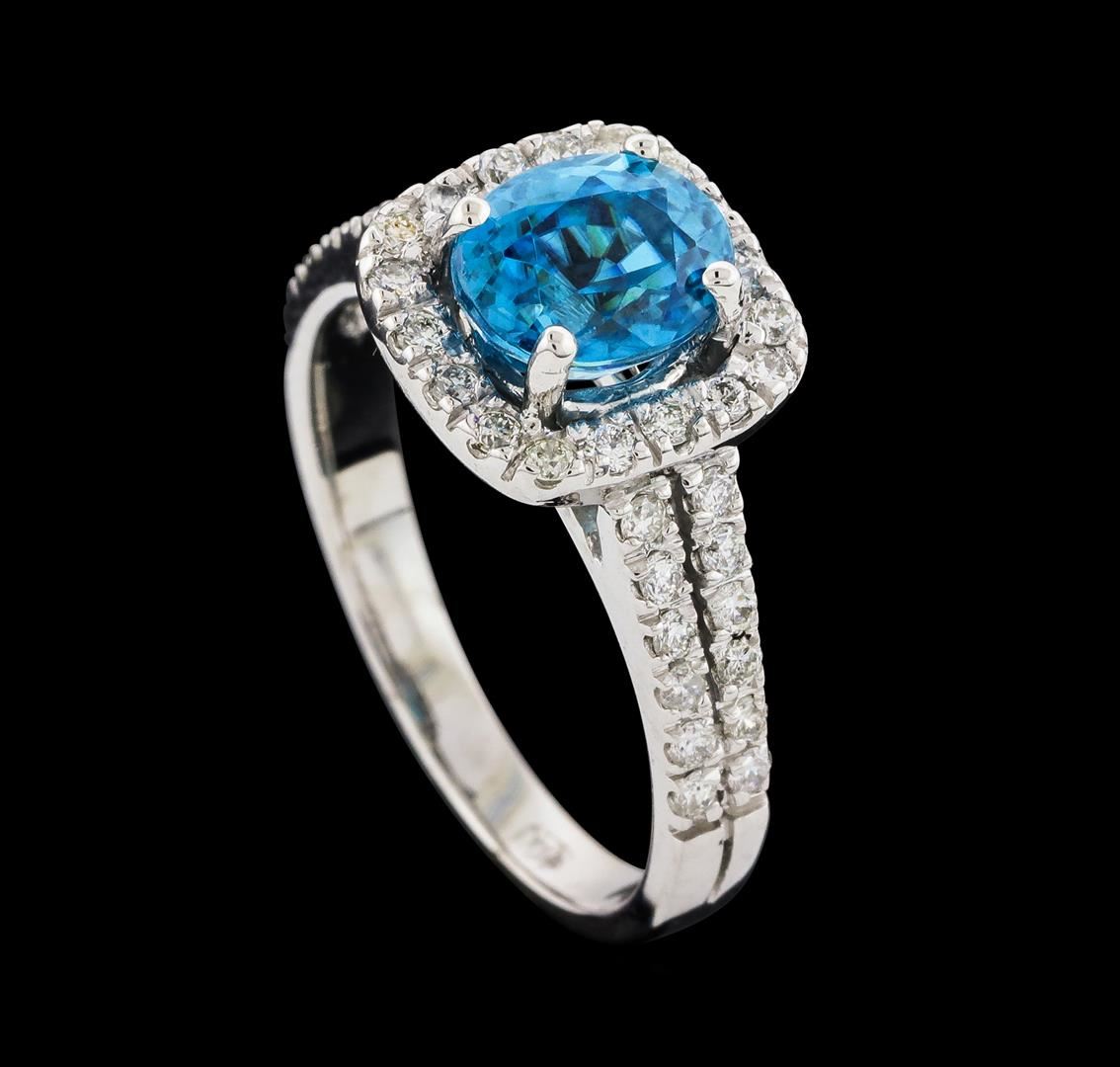 One Blue Zircon and Diamond Ring featuring: 14KT White Gold with a total weight of 3.80 grams, Blue Zircon with a total weight of 2.34ct, and side diamonds with a weight of 0.45ctw.
