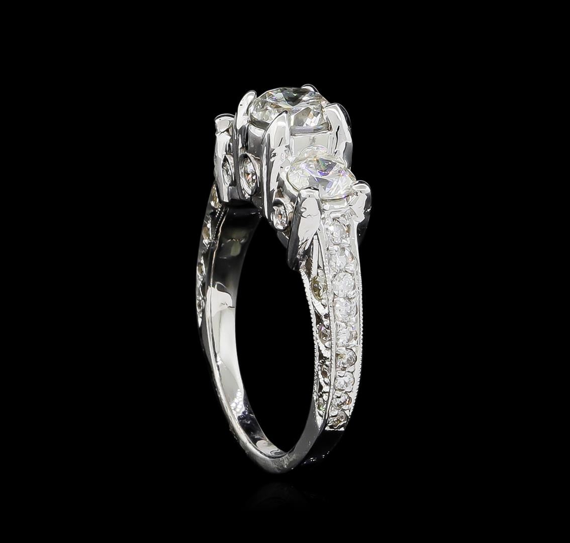 One electronically tested 18KT white gold ladies cast diamond unity ring. The unity ring features a series of three round brilliant diamonds supported by a diamond accented under gallery and diamond set shoulders, completed by a one and one-half millimeter wide band. Bright polish finish with milgrain detailing. Condition is good. Containing: One prong set round brilliant cut diamond, measuring 5.82 - 5.81 x 4.05mm (depth est.), 10.00.%. GTCF approximate weight of 1.01ct. Graded in the setting. Clarity: I-1. Color: 69.6%. Table 67.0%. Two prong set round brilliant cut diamonds, measuring 4.70 - 4.55 x 2.78mm (depth est.) approximate total weight of 2 Stones = 0.75ct. Graded in the setting. Clarity: SI-2. Color: I - J Eighteen bead & bezel set round brilliant cut diamonds, measuring 1.80 - 1.50 x 0.99mm (depth est.) approximate total weight of 18 Stones = 0.34ct. Graded in the setting. Clarity: SI-1 to I-1. Color: G - I Twenty-Two bead & bezel set round brilliant cut diamonds, measuring 1.40 - 1.20 x 0.78mm (depth est.) approximate total weight of 22 Stones = 0.24ct. Graded in the setting. Clarity: SI-1 to I-1. Color: G - I. Total Weight of Diamonds 2.34ct. Total Weight of Ring 6.90gm. AIG Appraised at $16,460.00.