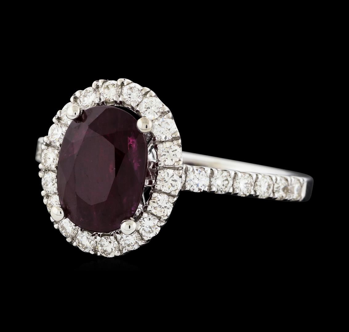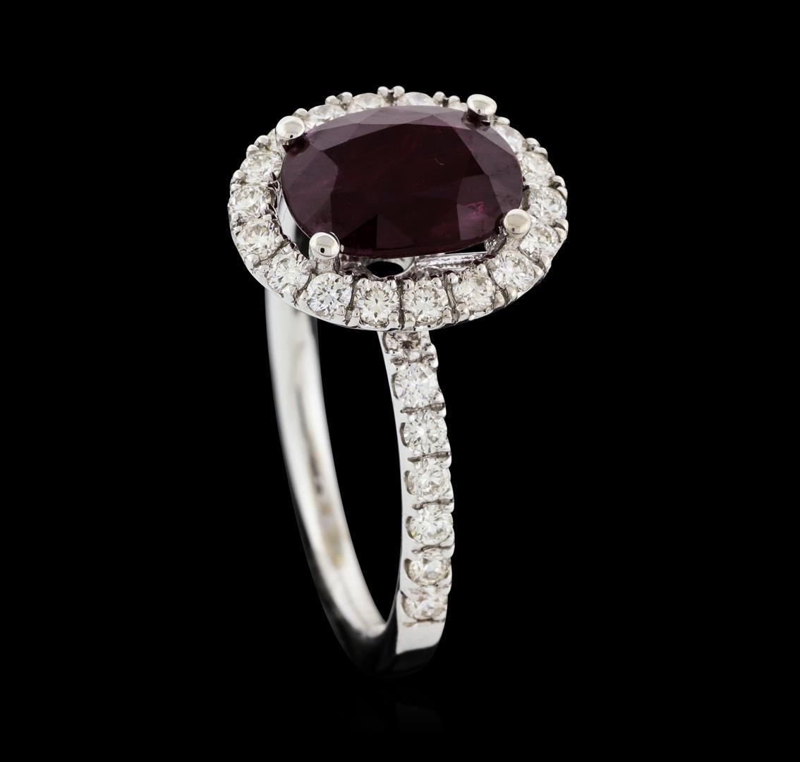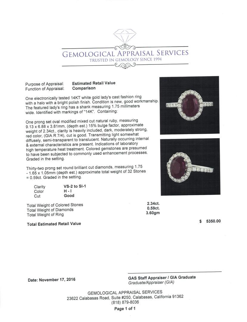 One electronically tested 14KT white gold lady's cast fashion ring with a halo with a bright polish finish. The featured lady's ring has a shank measuring 1.75 millimeters wide. Identified with markings of '14K'. Condition is new, good workmanship. Containing: One prong set oval modified mixed cut natural ruby, measuring 9.13 x 6.88 x 3.81mm, (depth est.) 15%. bulge factor, approximate weight of 2.34ct., clarity is heavily included, dark, moderately strong, red color, (GIA R 7/4), cut is good. Transmitting light somewhat diffusely, semi-transparent to translucent. Naturally occurring internal & external characteristics are present. Indications of laboratory high temperature heat treatment. Colored gemstones are presumed to have been subjected to commonly used enhancement processes. Graded in the setting. Thirty-Two prong set round brilliant cut diamonds, measuring 1.75 - 1.65 x 1.05mm (depth est.) approximate total weight of 32 Stones = 0.59ct. Graded in the setting. Clarity VS-2 to SI-1. Color: H - I Cut Good. Total Weight of Colored Stones 2.34ct.. Total Weight of Diamonds 0.59ct.. Total Weight of Ring 3.60gm. GAS Appraised at $5,350.00.