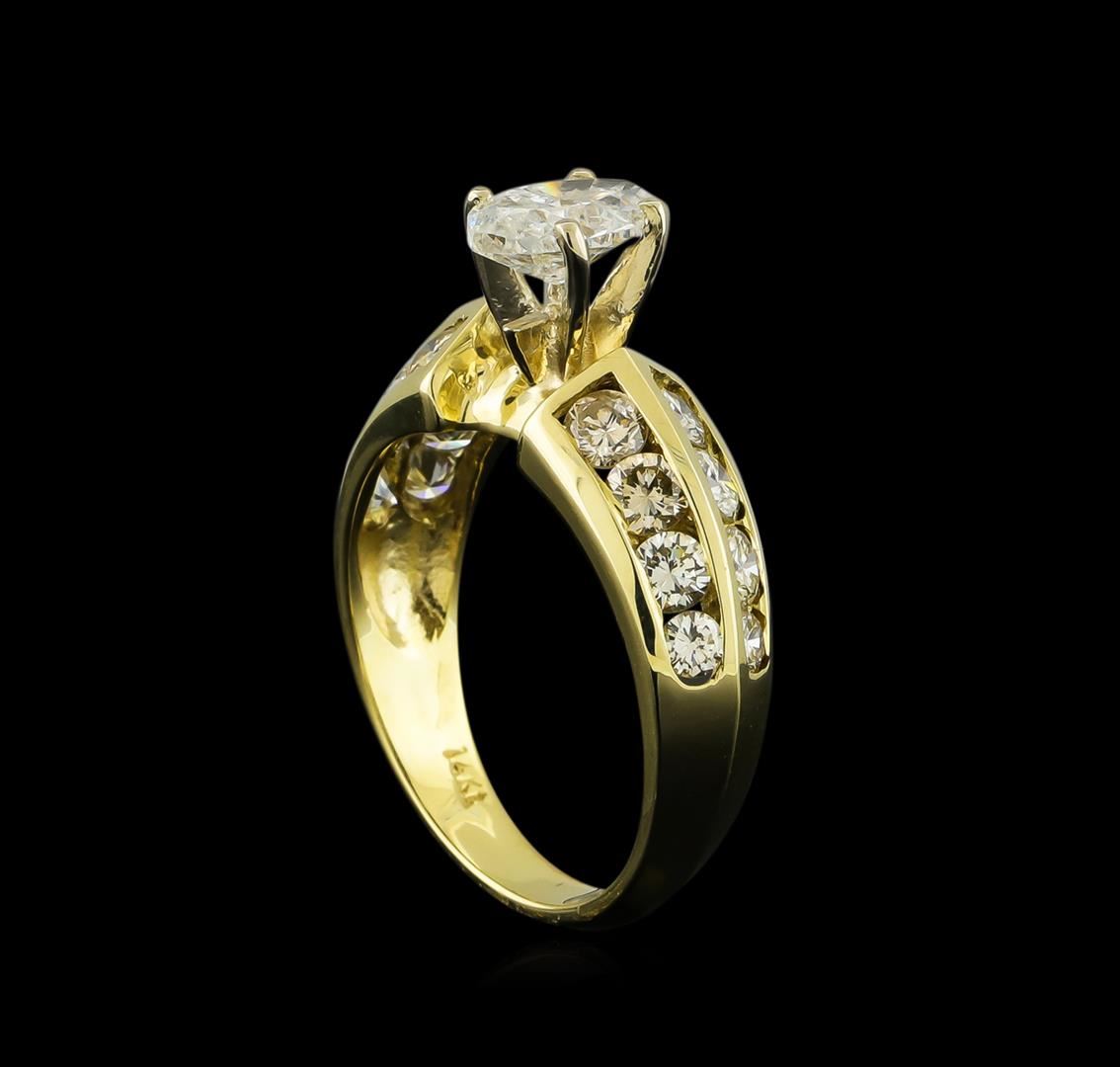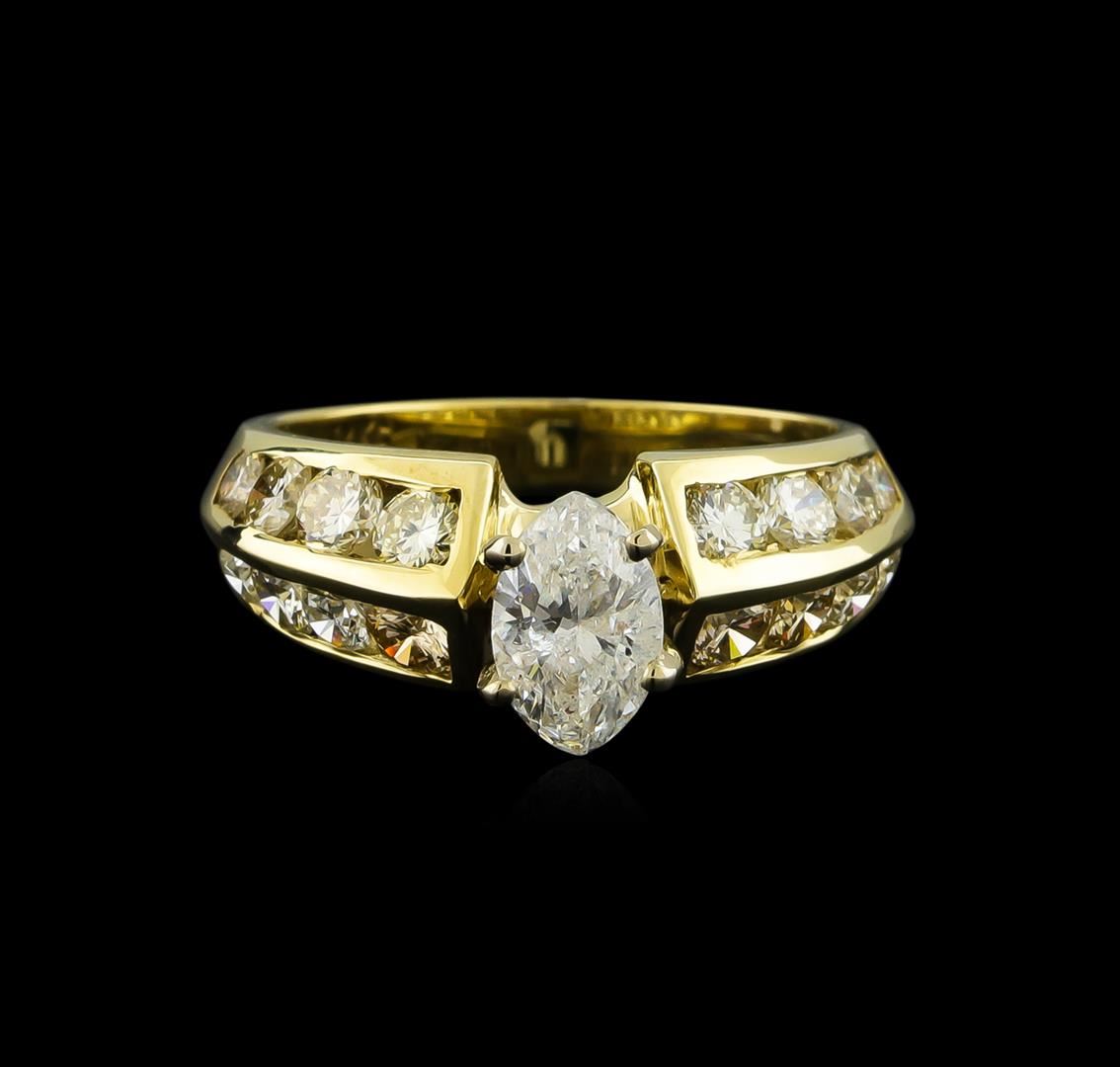 One electronically tested 14KT yellow gold lady's cast wedding ring with a bright polish finish. The featured lady's ring has a shank measuring 3.00 millimeters wide. Identified with markings of "14K". Condition is new, good workmanship. Containing: One prong set oval shaped cut diamond, measuring 8.13 x 5.20 x 3.28mm (depth est.) , 5.00.%. GTCF approximate weight of 0.96ct. Graded in the setting. Clarity: I-2. Color: G - Good Twelve channel set round brilliant cut diamonds, measuring 3.00 - 2.90 x 1.83mm (depth est.) approximate total weight of 12 Stones = 1.17ct. Graded in the setting. Clarity: VS-2 to SI-2. Color: I - Very Good Four channel set round brilliant cut diamonds, measuring 2.50 - 2.40 x 1.52mm (depth est.) approximate total weight of 4 Stones = 0.22ct. Graded in the setting. Clarity: VS-1 to VS-2. Color: H - I. Cut Very Good. Total Weight of Diamonds 2.35ct. Total Weight of Ring 5.10gm GAS Appraised at $8,875.00.