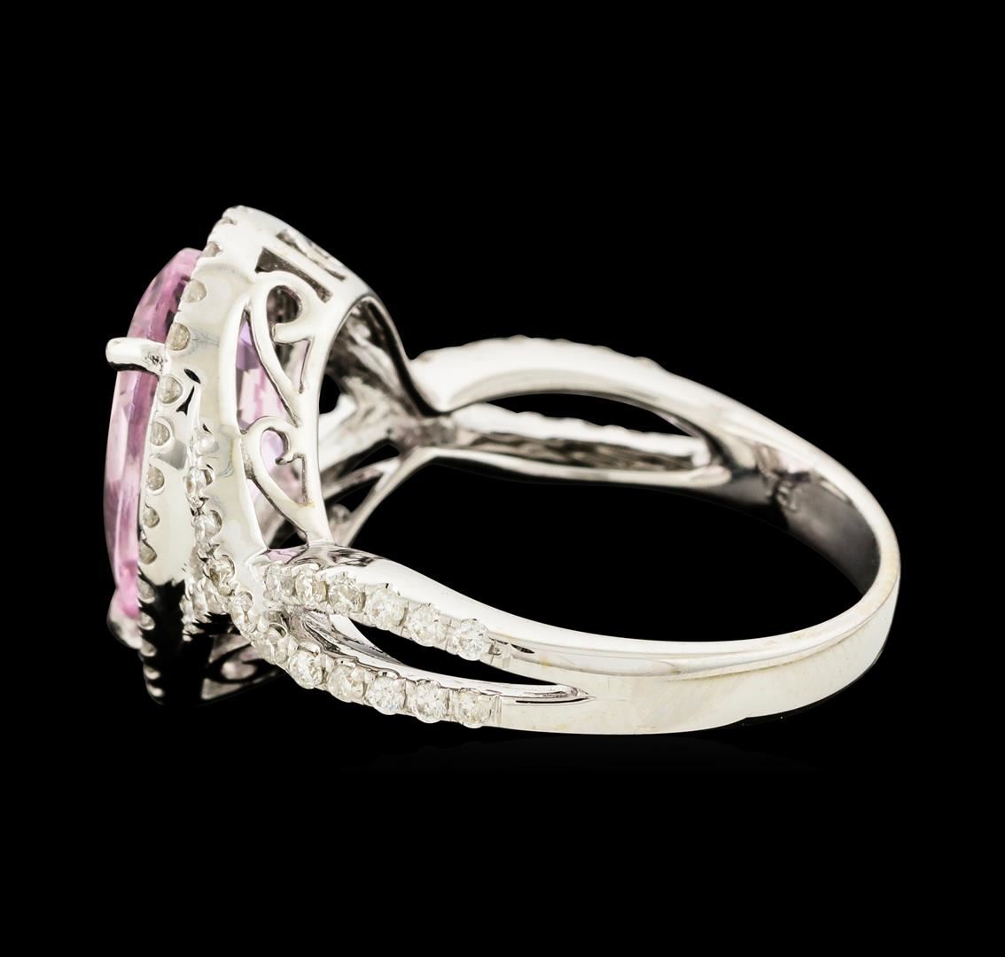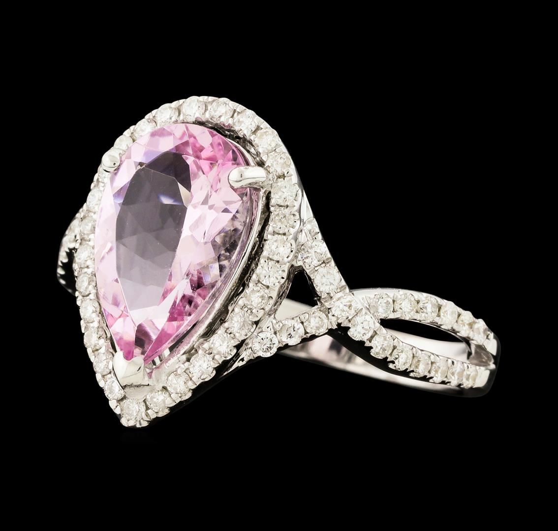 One electronically tested 18KT white gold lady's cast fashion ring with a split crossover shank with halo with a bright polish finish. The featured lady's ring has a shank measuring 2.52 millimeters wide. Identified with markings of '750'. Condition is new, good workmanship. Containing: One prong set pear modified brilliant cut natural morganite, measuring 12.00 x 7.85 x 4.81mm, (depth est.) approximate weight of 2.35ct., clarity is eye clean, light, moderately strong, red color, (GIA R 3/4), cut is good. Transmitting light with no distortion, transparent. Colored gemstones are presumed to have been subjected to commonly used enhancement processes. Graded in the setting. Sixty-Six prong set round brilliant cut diamonds, measuring 1.30 - 1.20 x 0.78mm (depth est.) approximate total weight of 66 Stones = 0.50ct. Graded in the setting. Clarity SI-2 to I-1. Color: H - I Cut Good. Total Weight of Colored Stones 2.35ct.. Total Weight of Diamonds 0.50ct.. Total Weight of Ring 5.40gm. GAS Appraised at $3,730.00.