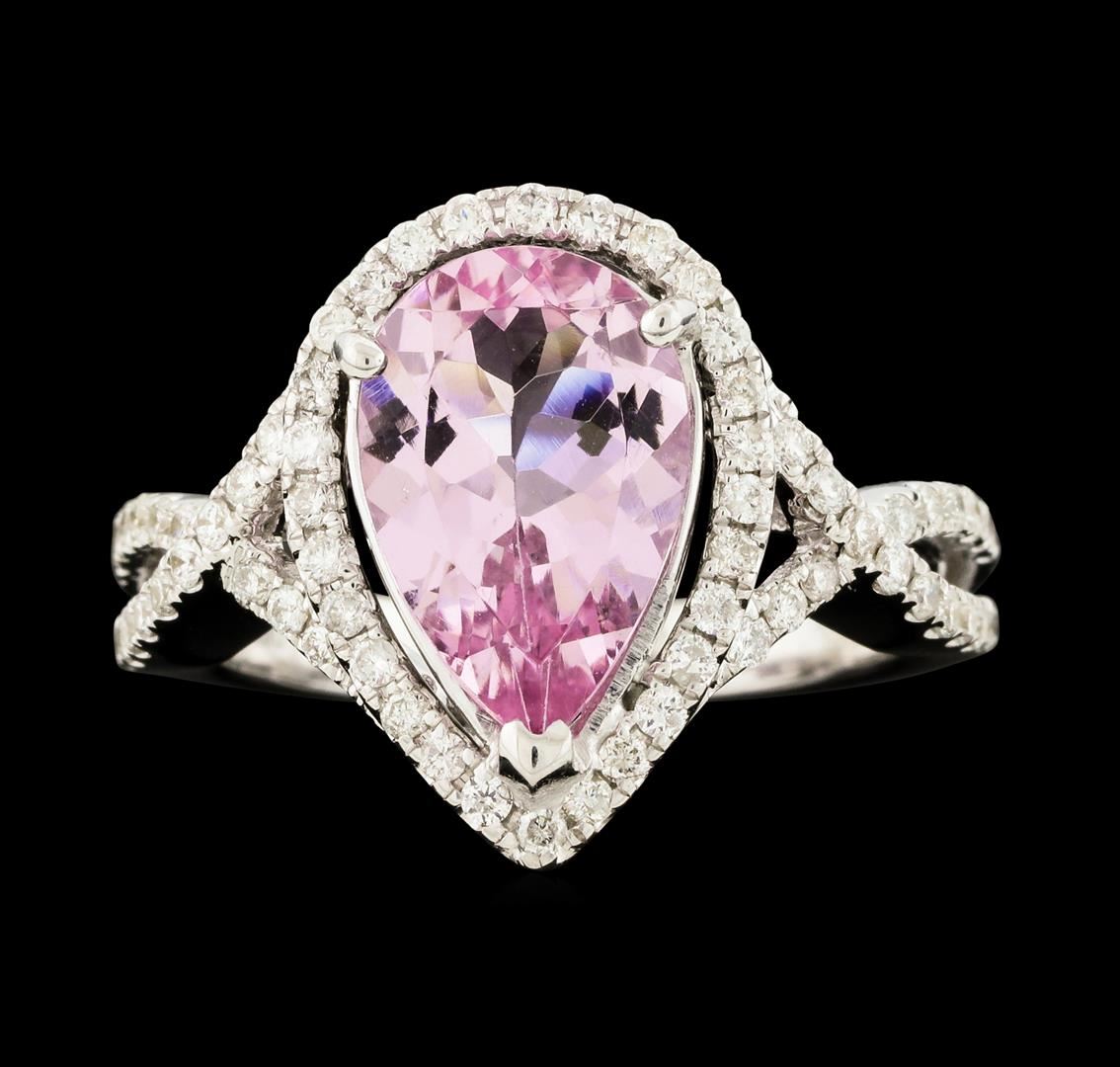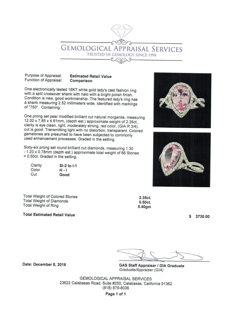 One electronically tested 18KT white gold lady's cast fashion ring with a split crossover shank with halo with a bright polish finish. The featured lady's ring has a shank measuring 2.52 millimeters wide. Identified with markings of '750'. Condition is new, good workmanship. Containing: One prong set pear modified brilliant cut natural morganite, measuring 12.00 x 7.85 x 4.81mm, (depth est.) approximate weight of 2.35ct., clarity is eye clean, light, moderately strong, red color, (GIA R 3/4), cut is good. Transmitting light with no distortion, transparent. Colored gemstones are presumed to have been subjected to commonly used enhancement processes. Graded in the setting. Sixty-Six prong set round brilliant cut diamonds, measuring 1.30 - 1.20 x 0.78mm (depth est.) approximate total weight of 66 Stones = 0.50ct. Graded in the setting. Clarity SI-2 to I-1. Color: H - I Cut Good. Total Weight of Colored Stones 2.35ct.. Total Weight of Diamonds 0.50ct.. Total Weight of Ring 5.40gm. GAS Appraised at $3,730.00.