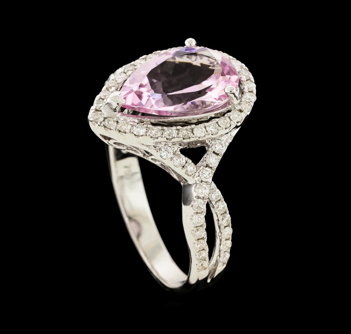 One electronically tested 18KT white gold lady's cast fashion ring with a split crossover shank with halo with a bright polish finish. The featured lady's ring has a shank measuring 2.52 millimeters wide. Identified with markings of '750'. Condition is new, good workmanship. Containing: One prong set pear modified brilliant cut natural morganite, measuring 12.00 x 7.85 x 4.81mm, (depth est.) approximate weight of 2.35ct., clarity is eye clean, light, moderately strong, red color, (GIA R 3/4), cut is good. Transmitting light with no distortion, transparent. Colored gemstones are presumed to have been subjected to commonly used enhancement processes. Graded in the setting. Sixty-Six prong set round brilliant cut diamonds, measuring 1.30 - 1.20 x 0.78mm (depth est.) approximate total weight of 66 Stones = 0.50ct. Graded in the setting. Clarity SI-2 to I-1. Color: H - I Cut Good. Total Weight of Colored Stones 2.35ct.. Total Weight of Diamonds 0.50ct.. Total Weight of Ring 5.40gm. GAS Appraised at $3,730.00.