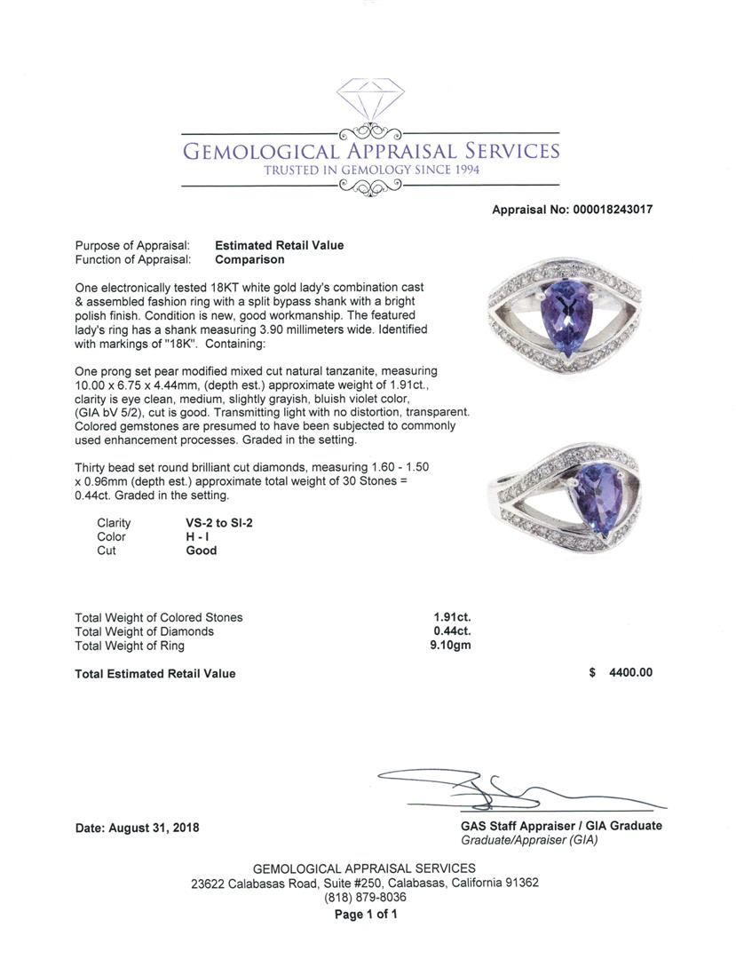 One electronically tested 18KT white gold lady's combination cast & assembled fashion ring with a split bypass shank with a bright polish finish. The featured lady's ring has a shank measuring 3.90 millimeters wide. Identified with markings of '18K'. Condition is new, good workmanship. Containing: One prong set pear modified mixed cut natural tanzanite, measuring 10.00 x 6.75 x 4.44mm, (depth est.) approximate weight of 1.91ct., clarity is eye clean, medium, slightly grayish, bluish violet color, (GIA bV 5/2), cut is good. Transmitting light with no distortion, transparent. Colored gemstones are presumed to have been subjected to commonly used enhancement processes. Graded in the setting. Thirty bead set round brilliant cut diamonds, measuring 1.60 - 1.50 x 0.96mm (depth est.) approximate total weight of 30 Stones = 0.44ct. Graded in the setting. Color H - I Clarity VS-2 to SI-2 Cut Good. Total Weight of Colored Stones 1.91ct.. Total Weight of Diamonds 0.44ct.. Total Weight of Ring 9.10gm GAS Appraised at $4400.00. GAS Appraised.