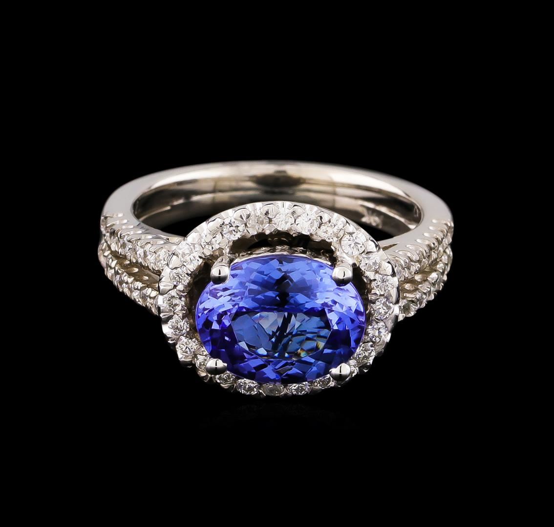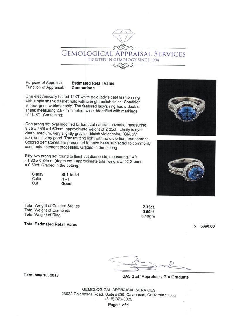 One electronically tested 14KT white gold lady's cast fashion ring with a split shank basket halo with a bright polish finish. The featured lady's ring has a double shank measuring 2.87 millimeters wide. Identified with markings of "14K". Condition is new, good workmanship. Containing: One prong set oval modified brilliant cut natural tanzanite, measuring 9.55 x 7.66 x 4.60mm, approximate weight of 2.35ct., clarity is eye clean, medium, very slightly grayish, bluish violet color, (GIA bV 5/3), cut is very good. Transmitting light with no distortion, transparent. Colored gemstones are presumed to have been subjected to commonly used enhancement processes. Graded in the setting. Fifty-Two prong set round brilliant cut diamonds, measuring 1.40 - 1.30 x 0.84mm (depth est.) approximate total weight of 52 Stones = 0.50ct. Graded in the setting. Clarity: SI-1 to I-1. Color: H - I. Cut Good. Total Weight of Colored Stones 2.35ct. Total Weight of Diamonds 0.50ct. Total Weight of Ring 6.10gm. GAS Appraised at $5,660.00.