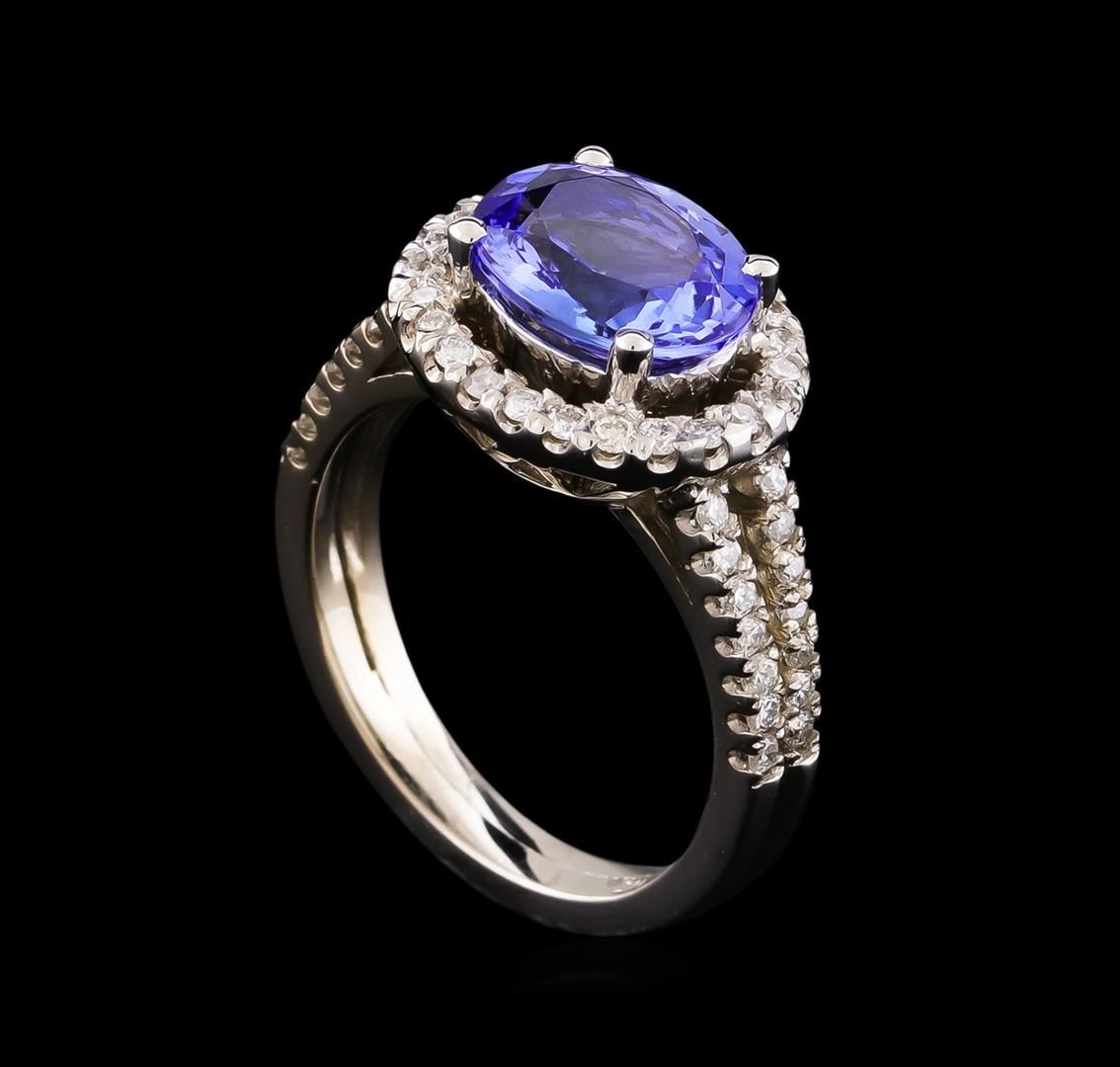 One electronically tested 14KT white gold lady's cast fashion ring with a split shank basket halo with a bright polish finish. The featured lady's ring has a double shank measuring 2.87 millimeters wide. Identified with markings of "14K". Condition is new, good workmanship. Containing: One prong set oval modified brilliant cut natural tanzanite, measuring 9.55 x 7.66 x 4.60mm, approximate weight of 2.35ct., clarity is eye clean, medium, very slightly grayish, bluish violet color, (GIA bV 5/3), cut is very good. Transmitting light with no distortion, transparent. Colored gemstones are presumed to have been subjected to commonly used enhancement processes. Graded in the setting. Fifty-Two prong set round brilliant cut diamonds, measuring 1.40 - 1.30 x 0.84mm (depth est.) approximate total weight of 52 Stones = 0.50ct. Graded in the setting. Clarity: SI-1 to I-1. Color: H - I. Cut Good. Total Weight of Colored Stones 2.35ct. Total Weight of Diamonds 0.50ct. Total Weight of Ring 6.10gm. GAS Appraised at $5,660.00.