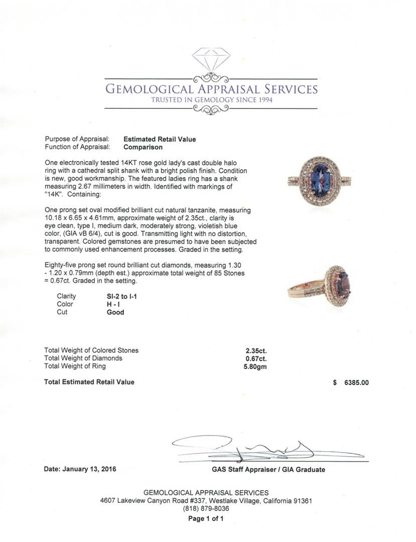One electronically tested 14KT rose gold lady's cast double halo ring with a cathedral split shank with a bright polish finish. The featured ladies ring has a shank measuring 2.67 millimeters in width. Identified with markings of "14K". Condition is new, good workmanship. Containing: One prong set oval modified brilliant cut natural tanzanite, measuring 10.18 x 6.65 x 4.61mm, approximate weight of 2.35ct., clarity is eye clean, type I, medium dark, moderately strong, violetish blue color, (GIA vB 6/4), cut is good. Transmitting light with no distortion, transparent. Colored gemstones are presumed to have been subjected to commonly used enhancement processes. Graded in the setting. Eighty-Five prong set round brilliant cut diamonds, measuring 1.30 - 1.20 x 0.79mm (depth est.) approximate total weight of 85 Stones = 0.67ct. Graded in the setting. Clarity: SI-2 to I-1. Color: H - I. Cut Good. Total Weight of Colored Stones 2.35ct. Total Weight of Diamonds 0.67ct. Total Weight of Ring 5.80gm. GAS Appraised at $6,385.00.