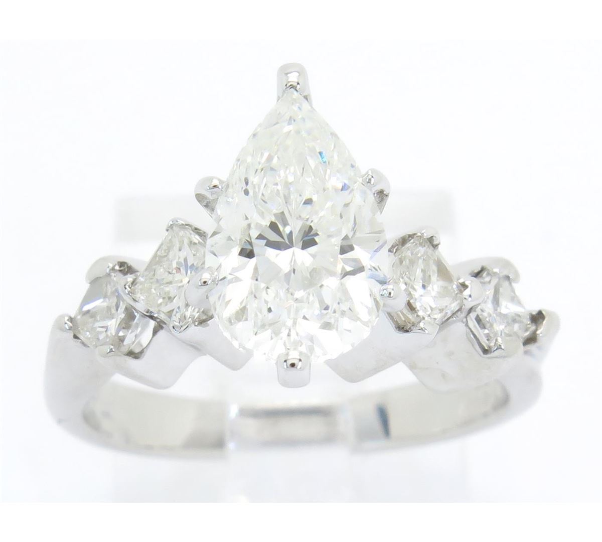 One tested 14K white gold diamond ring. Containing: One Pear Cut Diamond. Size: 2.01CT, Clarity: SI, Color: G-H. 4 Princess Cut Diamonds. Approximate total diamond weight: 2.35CTW. All diamonds are graded in the mounting unless otherwise stated. Weight of ring: 4.3 grams, Size: 5.0.