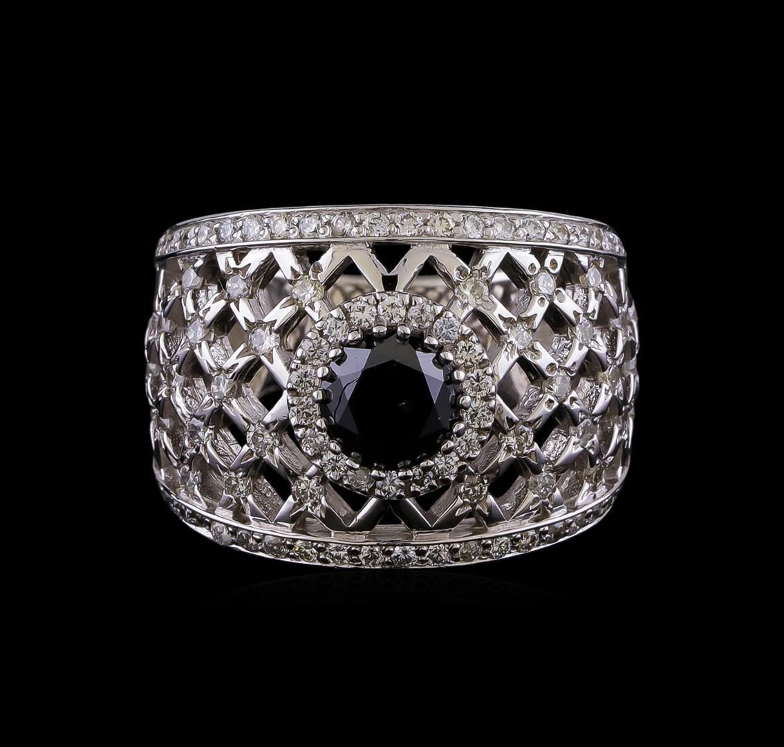 One electronically tested 14KT white lady's combination cast & assembled fashion ring with a wide band basket weave with a bright polish finish. The featured lady's ring has a shank measuring 5.40 millimeters in width. Identified with markings of "14K". Condition is new, good workmanship. Containing: One prong set round brilliant cut diamond, measuring 6.60 - 6.57 x 4.48mm (depth est.) , 5.00.%. GTCF approximate weight of 1.35ct. Colored gemstones are presumed to have been subjected to commonly used enhancement processes. Graded in the setting. Cut Good Thirty-Four prong set round brilliant cut diamonds, measuring 1.60 - 1.55 x 0.98mm (depth est.) approximate total weight of 34 Stones = 0.51ct. Graded in the setting. Clarity: SI-1 to SI-2. Color: G - Good Sixty-Two prong set round brilliant cut diamonds, measuring 1.30 - 1.25 x 0.80mm (depth est.) approximate total weight of 62 Stones = 0.50ct. Graded in the setting. Clarity: SI-1 to SI-2. Color: G - Good. Total Weight of Diamonds 2.36ct. Total Weight of Ring 9.80gm. GAS Appraised.