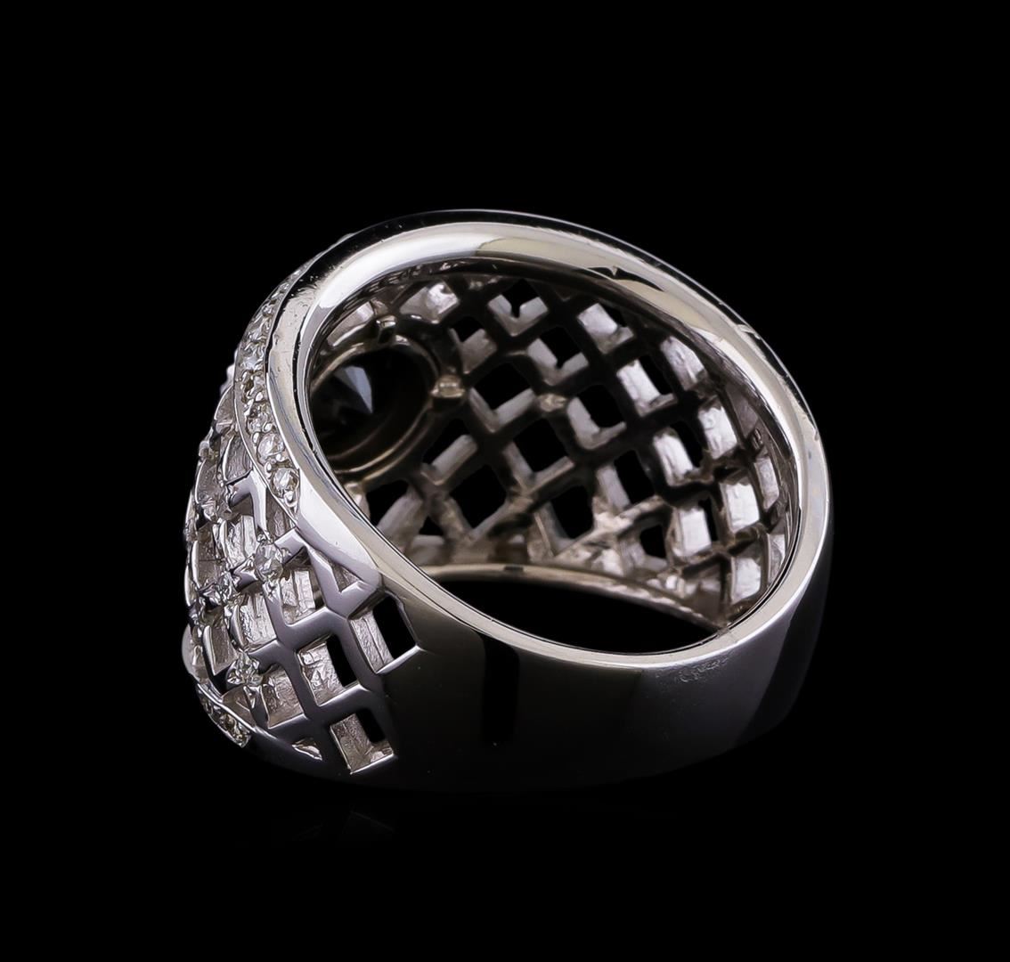 One electronically tested 14KT white lady's combination cast & assembled fashion ring with a wide band basket weave with a bright polish finish. The featured lady's ring has a shank measuring 5.40 millimeters in width. Identified with markings of "14K". Condition is new, good workmanship. Containing: One prong set round brilliant cut diamond, measuring 6.60 - 6.57 x 4.48mm (depth est.) , 5.00.%. GTCF approximate weight of 1.35ct. Colored gemstones are presumed to have been subjected to commonly used enhancement processes. Graded in the setting. Cut Good Thirty-Four prong set round brilliant cut diamonds, measuring 1.60 - 1.55 x 0.98mm (depth est.) approximate total weight of 34 Stones = 0.51ct. Graded in the setting. Clarity: SI-1 to SI-2. Color: G - Good Sixty-Two prong set round brilliant cut diamonds, measuring 1.30 - 1.25 x 0.80mm (depth est.) approximate total weight of 62 Stones = 0.50ct. Graded in the setting. Clarity: SI-1 to SI-2. Color: G - Good. Total Weight of Diamonds 2.36ct. Total Weight of Ring 9.80gm. GAS Appraised.