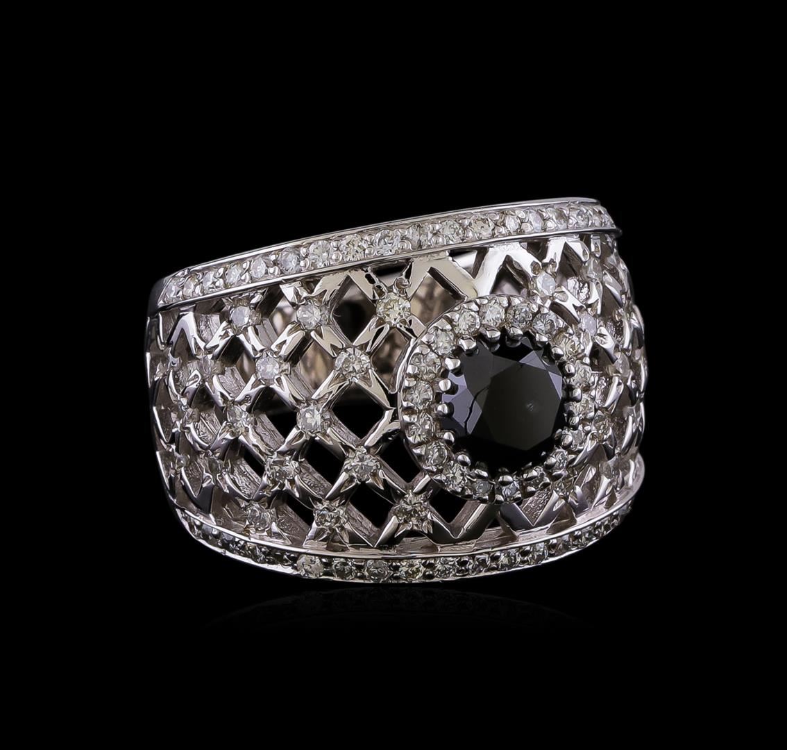 One electronically tested 14KT white lady's combination cast & assembled fashion ring with a wide band basket weave with a bright polish finish. The featured lady's ring has a shank measuring 5.40 millimeters in width. Identified with markings of "14K". Condition is new, good workmanship. Containing: One prong set round brilliant cut diamond, measuring 6.60 - 6.57 x 4.48mm (depth est.) , 5.00.%. GTCF approximate weight of 1.35ct. Colored gemstones are presumed to have been subjected to commonly used enhancement processes. Graded in the setting. Cut Good Thirty-Four prong set round brilliant cut diamonds, measuring 1.60 - 1.55 x 0.98mm (depth est.) approximate total weight of 34 Stones = 0.51ct. Graded in the setting. Clarity: SI-1 to SI-2. Color: G - Good Sixty-Two prong set round brilliant cut diamonds, measuring 1.30 - 1.25 x 0.80mm (depth est.) approximate total weight of 62 Stones = 0.50ct. Graded in the setting. Clarity: SI-1 to SI-2. Color: G - Good. Total Weight of Diamonds 2.36ct. Total Weight of Ring 9.80gm. GAS Appraised.