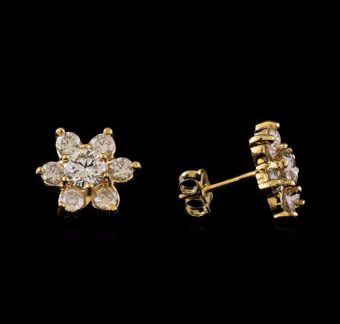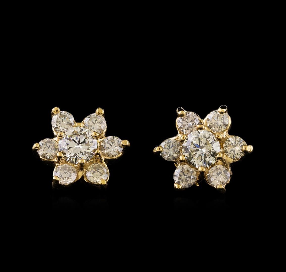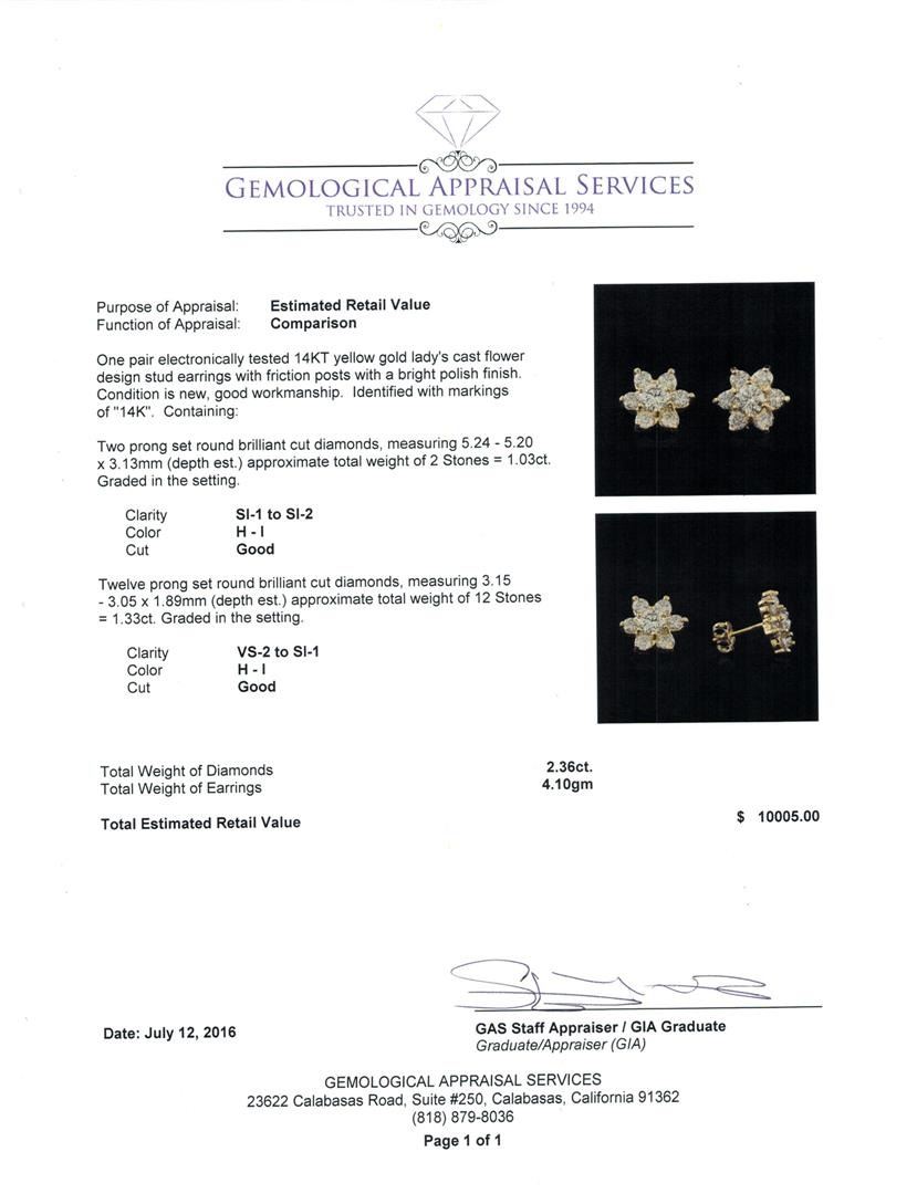 One pair electronically tested 14KT yellow gold lady's cast flower design stud earrings with friction posts with a bright polish finish. Identified with markings of '14K'. Condition is new, good workmanship. Containing: Two prong set round brilliant cut diamonds, measuring 5.24 - 5.20 x 3.13mm (depth est.) approximate total weight of 2 Stones = 1.03ct. Graded in the setting. Clarity SI-1 to SI-2. Color: H - I Cut Good Twelve prong set round brilliant cut diamonds, measuring 3.15 - 3.05 x 1.89mm (depth est.) approximate total weight of 12 Stones = 1.33ct. Graded in the setting. Clarity VS-2 to SI-1. Color: H - I Cut Good. Total Weight of Diamonds 2.36ct.. Total Weight of Earrings 4.10gm. GAS Appraised at $10,005.00.
