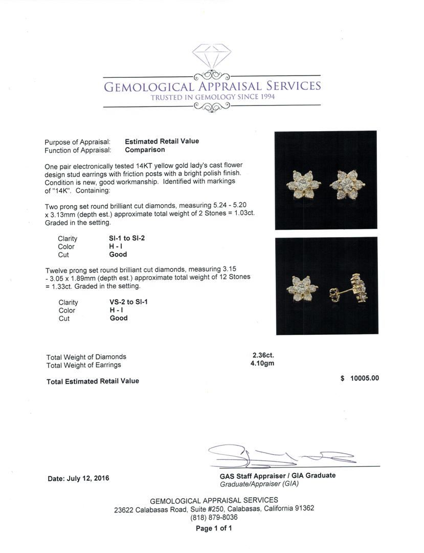 One pair electronically tested 14KT yellow gold lady's cast flower design stud earrings with friction posts with a bright polish finish. Identified with markings of '14K'. Condition is new, good workmanship. Containing: Two prong set round brilliant cut diamonds, measuring 5.24 - 5.20 x 3.13mm (depth est.) approximate total weight of 2 Stones = 1.03ct. Graded in the setting. Clarity SI-1 to SI-2. Color: H - I Cut Good Twelve prong set round brilliant cut diamonds, measuring 3.15 - 3.05 x 1.89mm (depth est.) approximate total weight of 12 Stones = 1.33ct. Graded in the setting. Clarity VS-2 to SI-1. Color: H - I Cut Good. Total Weight of Diamonds 2.36ct.. Total Weight of Earrings 4.10gm. GAS Appraised at $10,005.00.