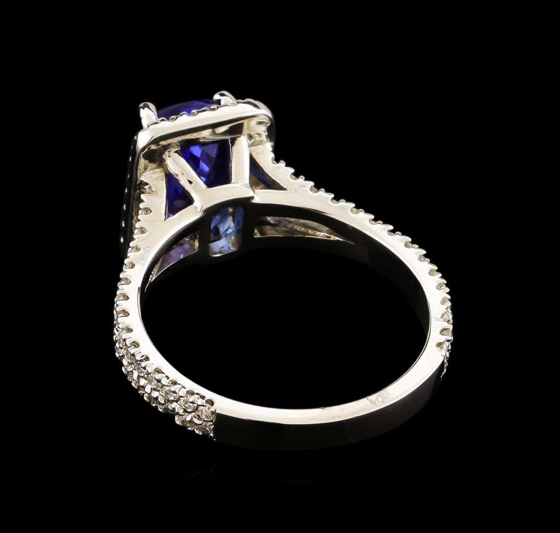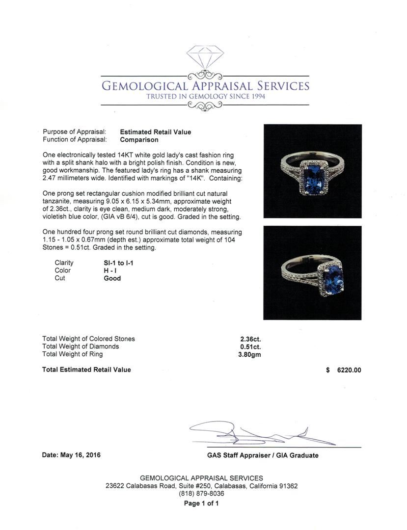 One electronically tested 14KT white gold lady's cast fashion ring with a split shank halo with a bright polish finish. The featured lady's ring has a shank measuring 2.47 millimeters wide. Identified with markings of "14K". Condition is new, good workmanship. Containing: One prong set rectangular cushion modified brilliant cut natural tanzanite, measuring 9.05 x 6.15 x 5.34mm, approximate weight of 2.36ct., clarity is eye clean, medium dark, moderately strong, violetish blue color, (GIA vB 6/4), cut is good. Graded in the setting. One Hundred Four prong set round brilliant cut diamonds, measuring 1.15 - 1.05 x 0.67mm (depth est.) approximate total weight of 104 Stones = 0.51ct. Graded in the setting. Clarity: SI-1 to I-1. Color: H - I. Cut Good. Total Weight of Colored Stones 2.36ct. Total Weight of Diamonds 0.51ct. Total Weight of Ring 3.80gm. GAS Appraised at $6,220.00.