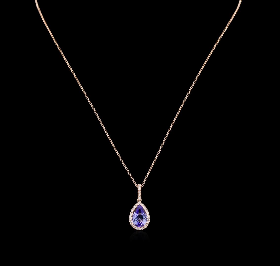 One pendant with chain featuring: 14KT rose gold weighing 2.15 grams containing one tanzanite with a total weight of 2.37ct and 30 diamonds with a total weight of 0.15ct.