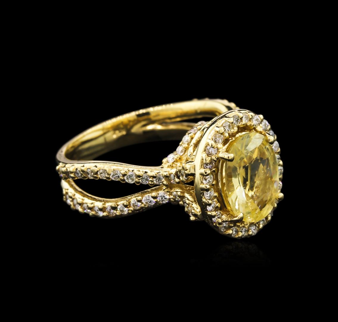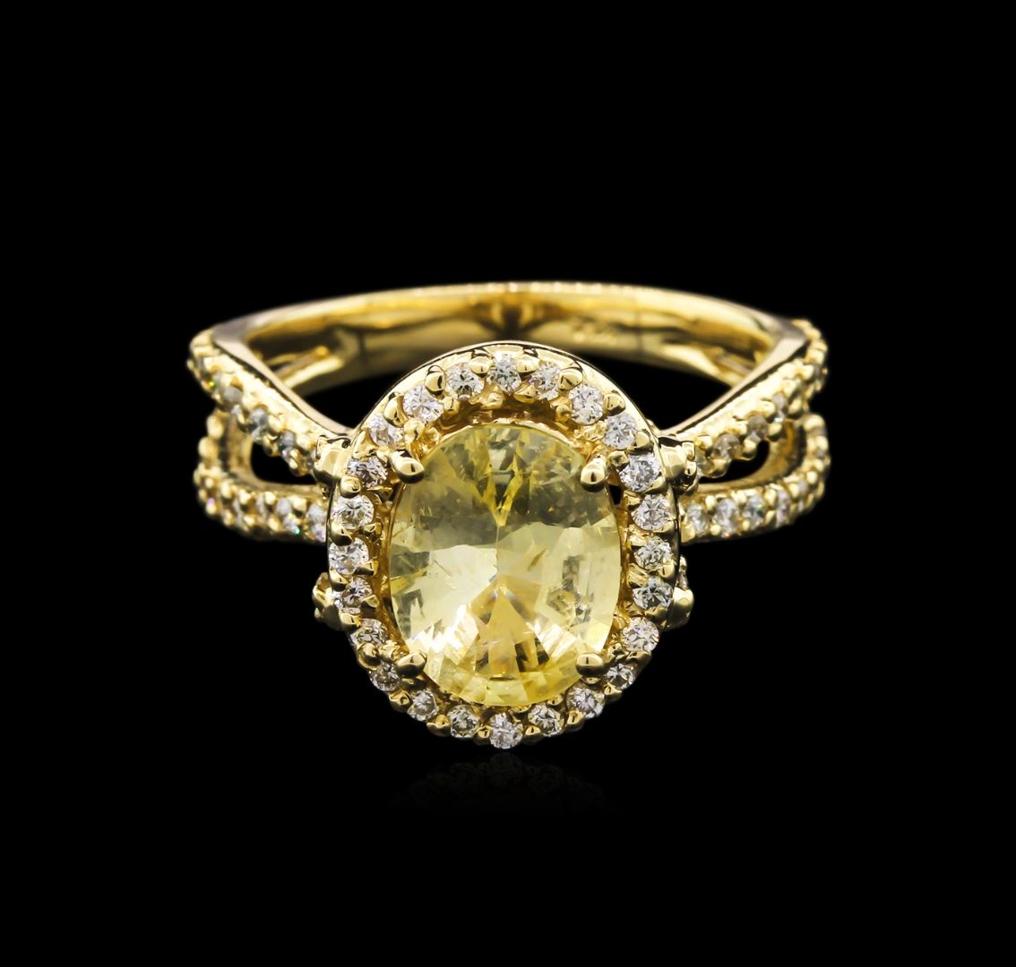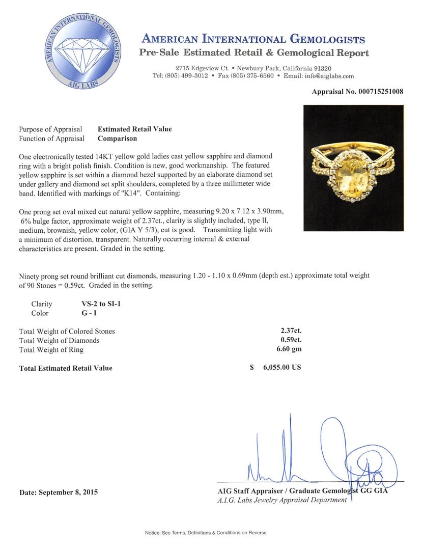 One electronically tested 14KT yellow gold ladies cast yellow sapphire and diamond ring with a bright polish finish. The featured yellow sapphire is set within a diamond bezel supported by an elaborate diamond set under gallery and diamond set split shoulders, completed by a three millimeter wide band. Identified with markings of "K14". Condition is new, good workmanship. Containing: One prong set oval mixed cut natural yellow sapphire, measuring 9.20 x 7.12 x 3.90mm, 6% bulge factor, approximate weight of 2.37ct., clarity is slightly included, type II, medium, brownish, yellow color, (GIA Y 5/3), cut is good. Transmitting light with a minimum of distortion, transparent. Naturally occurring internal & external characteristics are present. Graded in the setting. Ninety prong set round brilliant cut diamonds, measuring 1.20 - 1.10 x 0.69mm (depth est.) approximate total weight of 90 Stones = 0.59ct. Graded in the setting. Clarity: VS-2 to SI-1. Color: G - I. Total Weight of Colored Stones 2.37ct. Total Weight of Diamonds 0.59ct. Total Weight of Ring 6.60gm. AIG Appraised at $6,055.00.