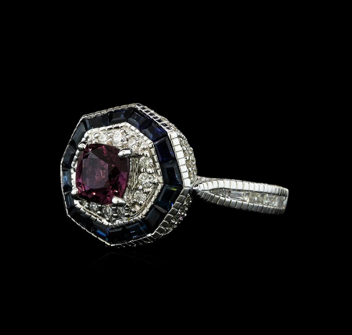 One electronically tested 18KT white gold lady's combination cast & assembled fashion ring with a octagonal double halo with a bright polish with milgrain detailing finish. The featured lady's ring has a shank measuring 1.85 millimeters wide. Identified with markings of '18K'. Condition is new, good workmanship. Containing: One prong set square cushion modified mixed cut natural purple sapphire, measuring 5.95 x 5.90 x 3.94mm, (depth est.) approximate weight of 1.05ct., clarity is slightly included, medium dark, very slightly grayish, reddish purple color, (GIA rP 6/3), cut is very good. Transmitting light with a minimum of distortion, transparent. Colored gemstones are presumed to have been subjected to commonly used enhancement processes. Graded in the setting. Sixteen channel set baguette standard step cut natural blue sapphires, measuring 2.60 x 2.00 x 1.50mm, (depth est.) approximate total weight of 1.33ct., clarity is eye clean, medium dark, moderately strong, blue color, (GIA B 6/4), cut is very good. Transmitting light with no distortion, transparent. Colored gemstones are presumed to have been subjected to commonly used enhancement processes. Graded in the setting. Four prong set round brilliant cut diamonds, measuring 1.60 - 1.50 x 0.96mm (depth est.) approximate total weight of 4 Stones = 0.06ct. Graded in the setting. Clarity VS-2 to SI-1. Color: G - H Cut Very Good One Hundred Twenty prong set round brilliant cut diamonds, measuring 1.25 - 1.20 x 0.74mm (depth est.) approximate total weight of 120 Stones = 0.79ct. Graded in the setting. Clarity VS-2 to SI-1. Color: G - H Cut Good Ten channel set baguette cut diamonds, measuring from 2.10 x 1.00 x 0.85mm (depth est.) to 2.70 x 1.30 x 1.11mm (depth est.) approximate total weight of 10 Stones = 0.20ct. Graded in the setting. Clarity VS-1 to VS-2. Color: G - H Cut Very Good. Total Weight of Colored Stones 2.38ct.. Total Weight of Diamonds 1.05ct.. Total Weight of Ring 6.00gm GAS Appraised at $8,685.00.