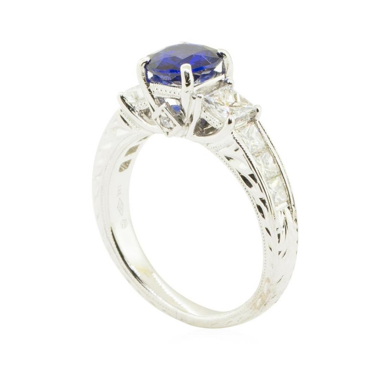 One electronically tested 18KT white gold lady's cast fashion straight line ring with a cathedrail scalloped shank with a bright polish with milgrain detailing finish. The featured lady's ring has a shank measuring 2.40 millimeters in width. Identified with markings of '18K'. Condition is like new, good workmanship. Containing: One prong set round modified brilliant cut natural blue sapphire, measuring 6.75 - 6.72 x 3.24 mm, (depth est.) approximate weight of 1.22ct., clarity is eye clean, dark, moderately strong, blue color, (GIA B 7/4), cut is good. Transmitting light with no distortion, transparent. Colored gemstones are presumed to have been subjected to commonly used enhancement processes. Graded in the setting. Two prong set princess cut diamonds, measuring 3.65 x 3.58 x 2.69mm (depth est.) approximate total weight of 2 Stones = 0.58ct. Graded in the setting. Color G - H Clarity VS-1 to VS-2 Cut Excellent Six channel set princess cut diamonds, measuring 2.70 x 2.40 x 1.80mm (depth est.) approximate total weight of 6 Stones = 0.58ct. Graded in the setting. Color H - I Clarity VS-1 to VS-2 Cut Very Good. Total Weight of Colored Stones 1.22ct.. Total Weight of Diamonds 1.16ct.. Total Weight of Ring 5.70gm GAS Appraised at $6130.00. GAS Appraised.