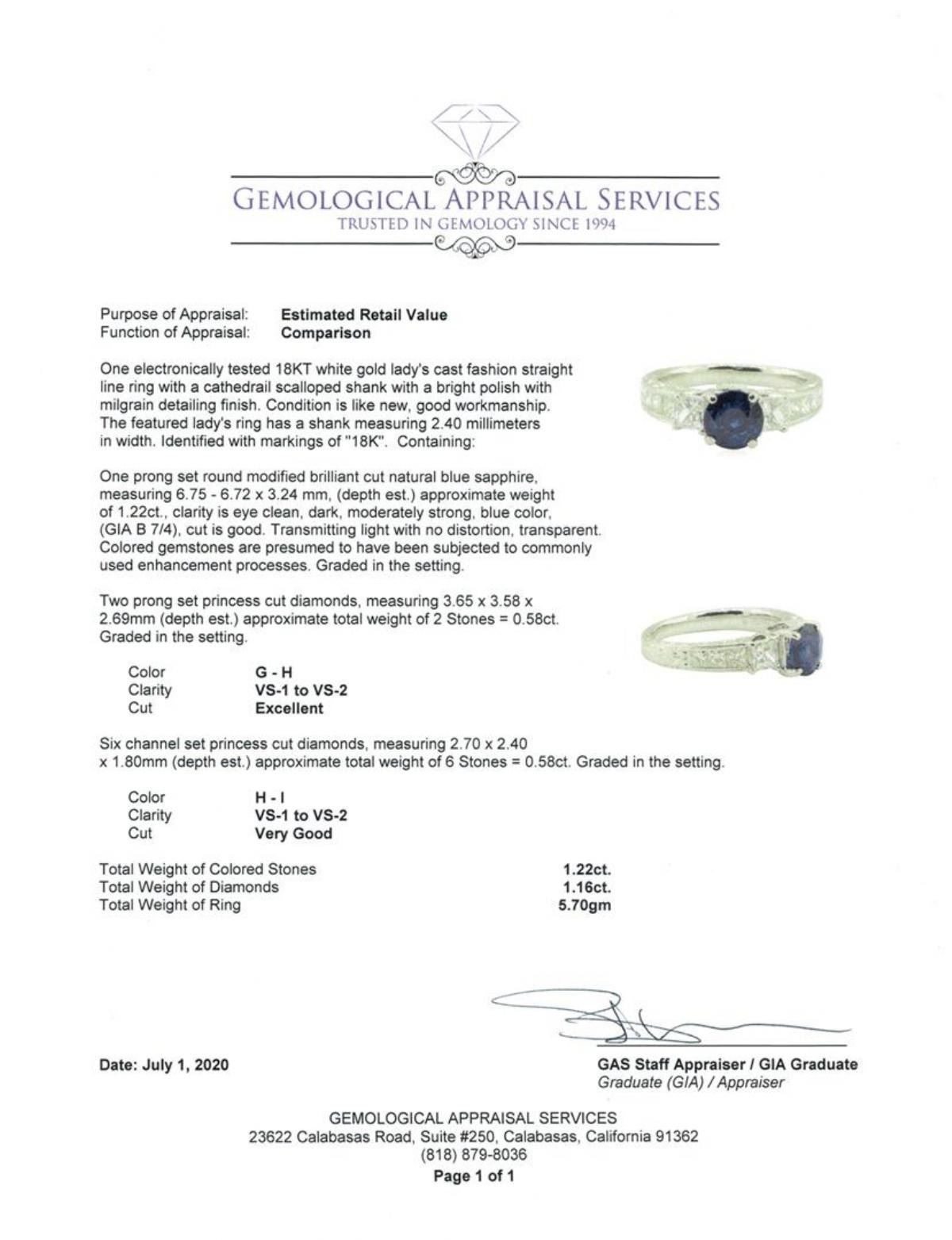 One electronically tested 18KT white gold lady's cast fashion straight line ring with a cathedrail scalloped shank with a bright polish with milgrain detailing finish. The featured lady's ring has a shank measuring 2.40 millimeters in width. Identified with markings of '18K'. Condition is like new, good workmanship. Containing: One prong set round modified brilliant cut natural blue sapphire, measuring 6.75 - 6.72 x 3.24 mm, (depth est.) approximate weight of 1.22ct., clarity is eye clean, dark, moderately strong, blue color, (GIA B 7/4), cut is good. Transmitting light with no distortion, transparent. Colored gemstones are presumed to have been subjected to commonly used enhancement processes. Graded in the setting. Two prong set princess cut diamonds, measuring 3.65 x 3.58 x 2.69mm (depth est.) approximate total weight of 2 Stones = 0.58ct. Graded in the setting. Color G - H Clarity VS-1 to VS-2 Cut Excellent Six channel set princess cut diamonds, measuring 2.70 x 2.40 x 1.80mm (depth est.) approximate total weight of 6 Stones = 0.58ct. Graded in the setting. Color H - I Clarity VS-1 to VS-2 Cut Very Good. Total Weight of Colored Stones 1.22ct.. Total Weight of Diamonds 1.16ct.. Total Weight of Ring 5.70gm GAS Appraised at $6130.00. GAS Appraised.