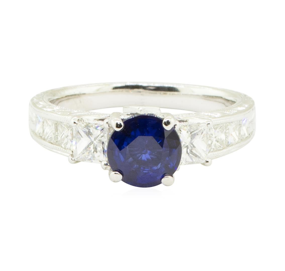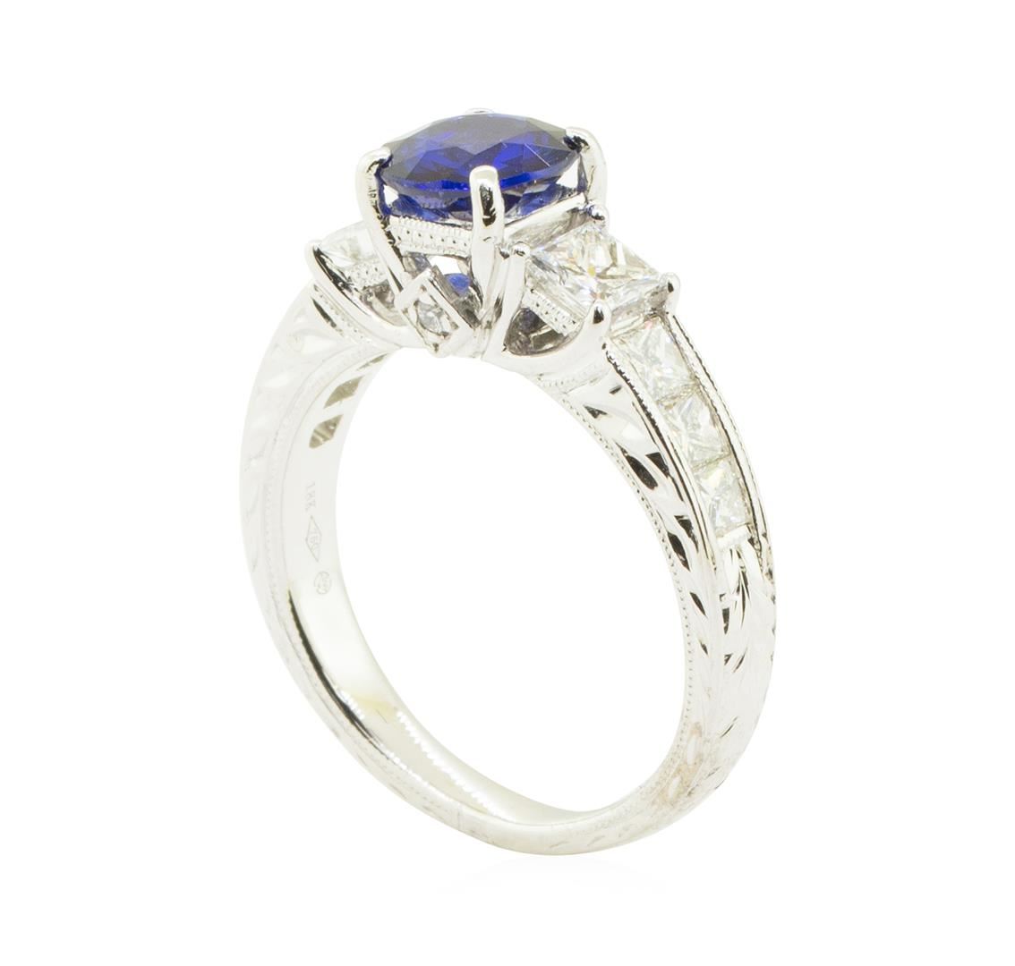 One electronically tested 18KT white gold lady's cast fashion straight line ring with a cathedrail scalloped shank with a bright polish with milgrain detailing finish. The featured lady's ring has a shank measuring 2.40 millimeters in width. Identified wi