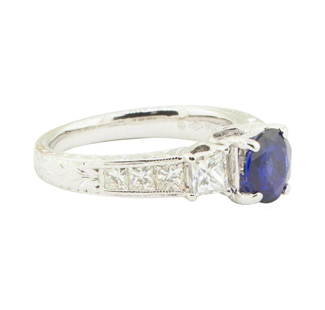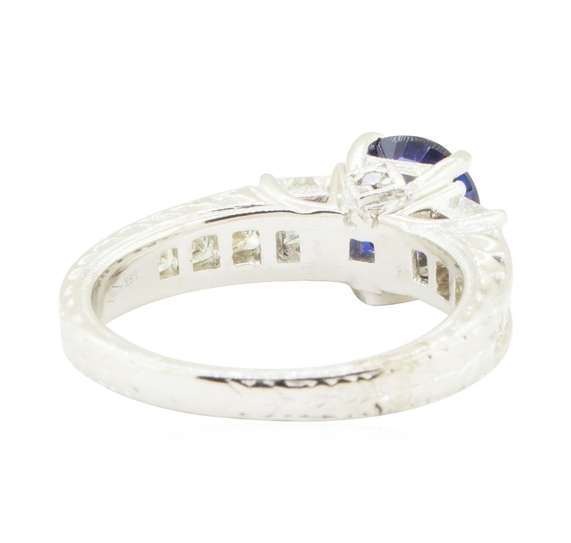 One electronically tested 18KT white gold lady's cast fashion straight line ring with a cathedrail scalloped shank with a bright polish with milgrain detailing finish. The featured lady's ring has a shank measuring 2.40 millimeters in width. Identified wi