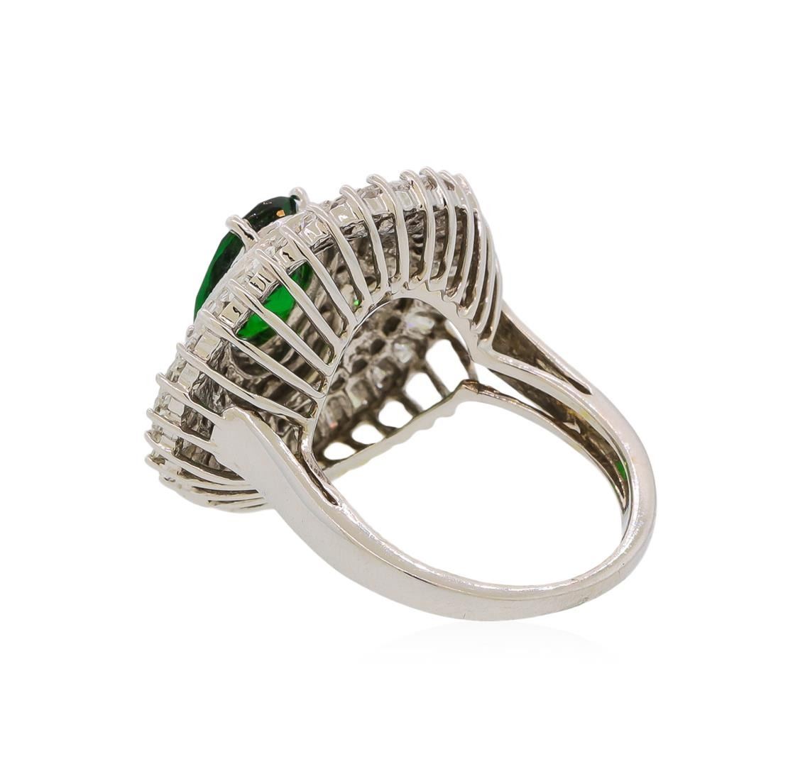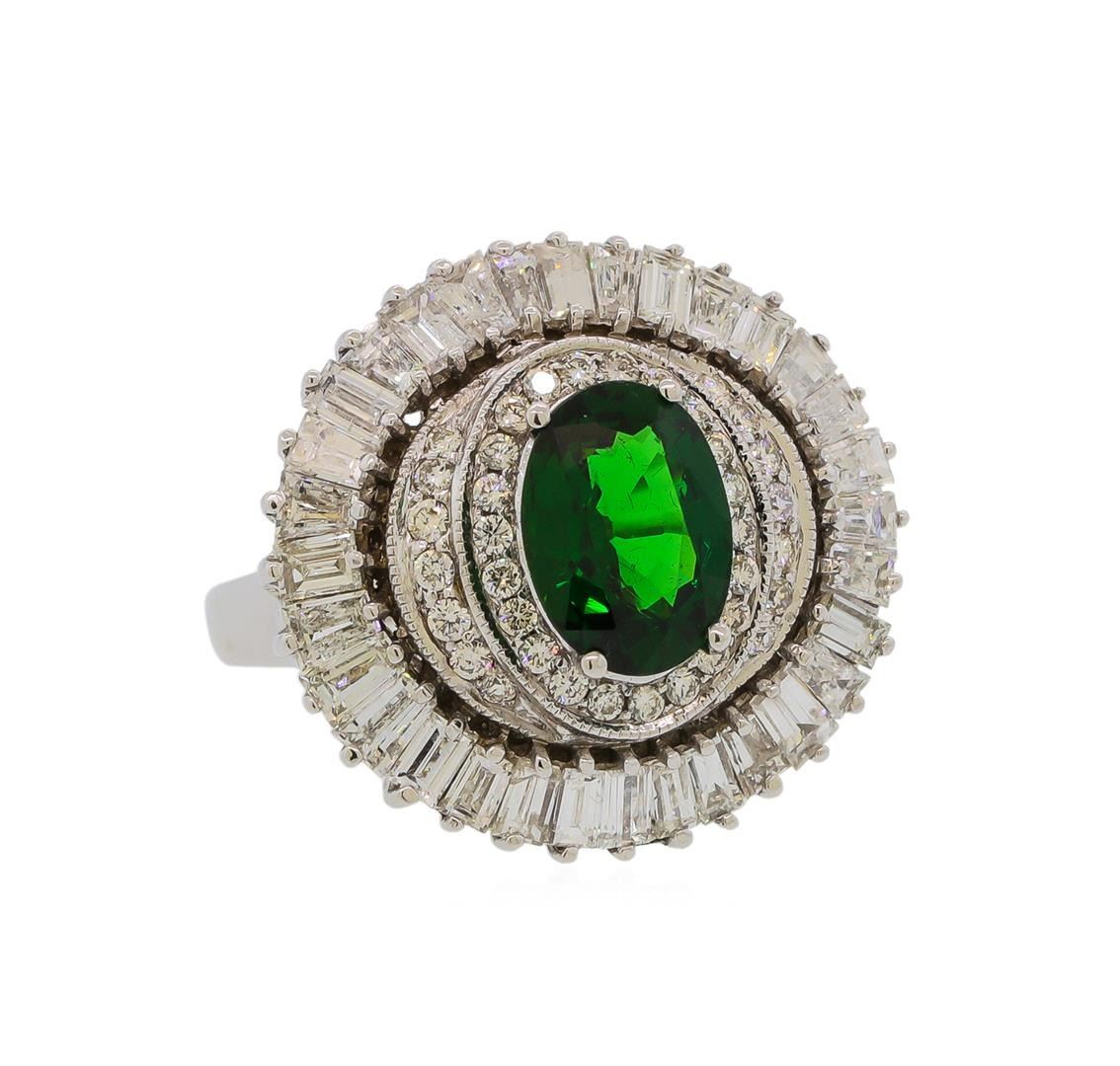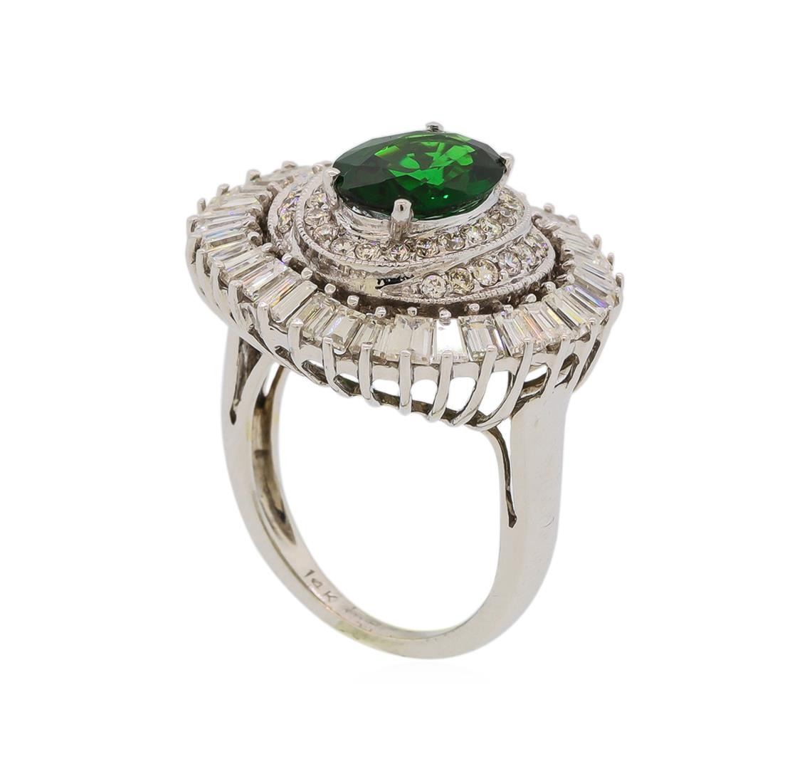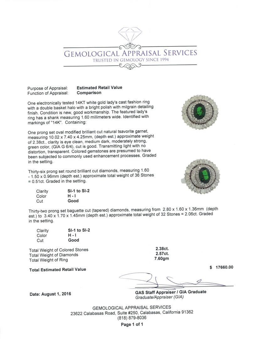 One electronically tested 14KT white gold lady's cast fashion ring with a double basket halo with a bright polish with milgrain detailing finish. The featured lady's ring has a shank measuring 1.60 millimeters wide. Identified with markings of '14K'. Condition is new, good workmanship. Containing: One prong set oval modified brilliant cut natural tsavorite garnet, measuring 10.02 x 7.40 x 4.25mm, (depth est.) approximate weight of 2.38ct., clarity is eye clean, medium dark, moderately strong, green color, (GIA G 6/4), cut is good. Transmitting light with no distortion, transparent. Colored gemstones are presumed to have been subjected to commonly used enhancement processes. Graded in the setting. Thirty-Six prong set round brilliant cut diamonds, measuring 1.60 - 1.50 x 0.96mm (depth est.) approximate total weight of 36 Stones = 0.51ct. Graded in the setting. Clarity SI-1 to SI-2. Color: H - I Cut Good Thirty-Two prong set baguette cut (tapered) diamonds, measuring from 2.80 x 1.60 x 1.36mm (depth est.) to 3.40 x 1.70 x 1.45mm (depth est.) approximate total weight of 32 Stones = 2.06ct. Graded in the setting. Clarity SI-1 to SI-2. Color: H - I Cut Good. Total Weight of Colored Stones 2.38ct.. Total Weight of Diamonds 2.57ct.. Total Weight of Ring 7.60gm. GAS Appraised at $17,660.00.