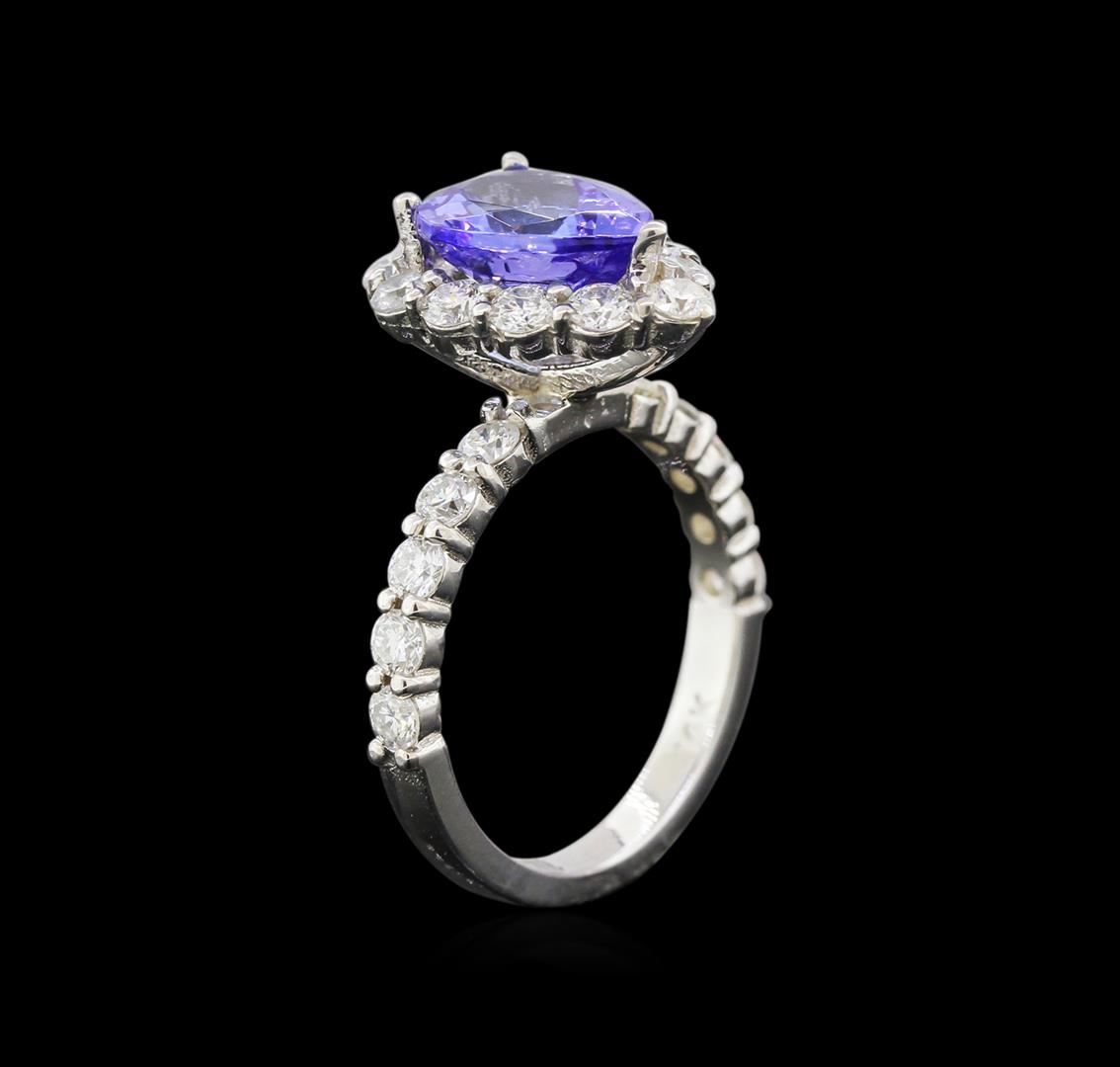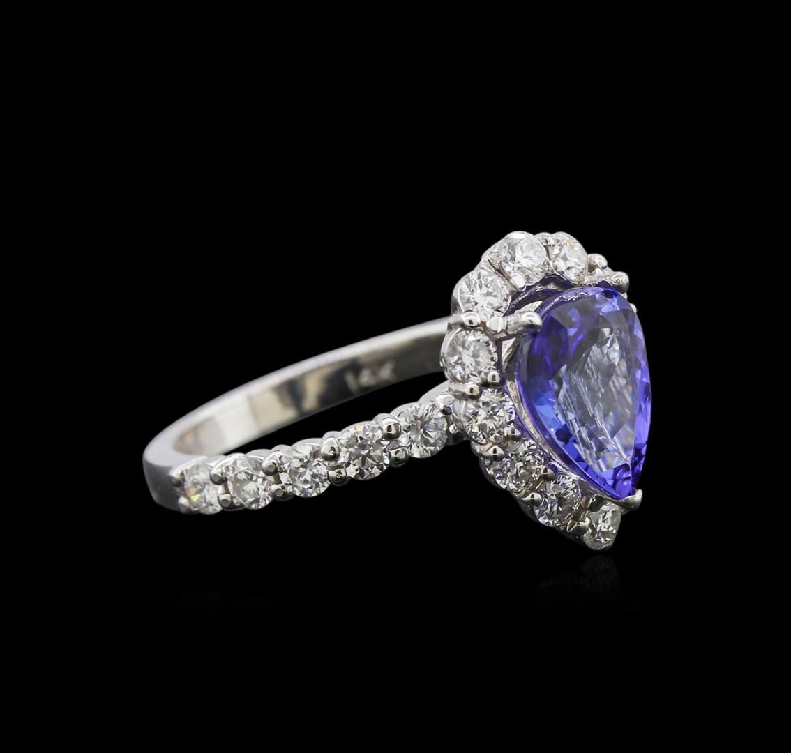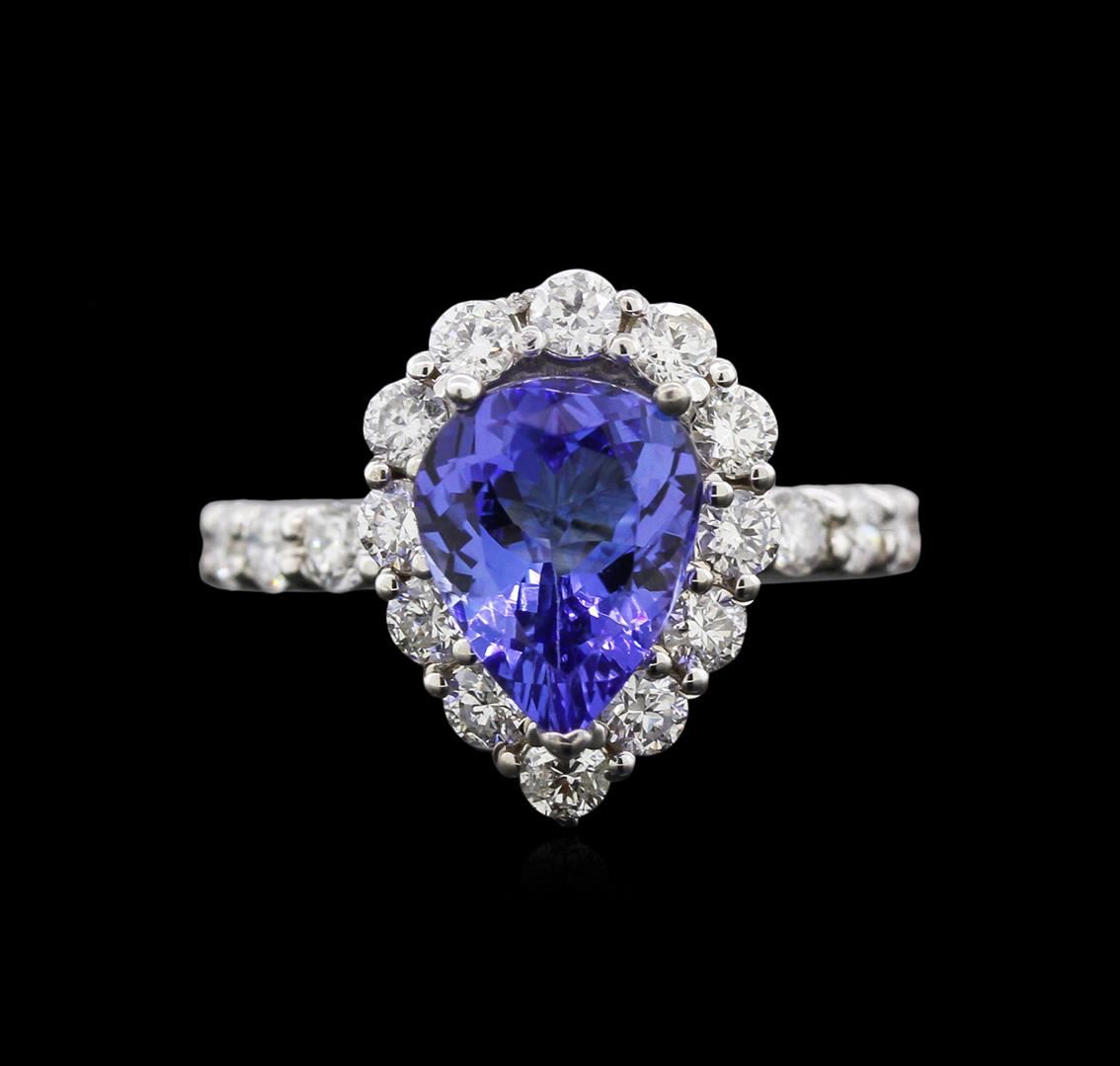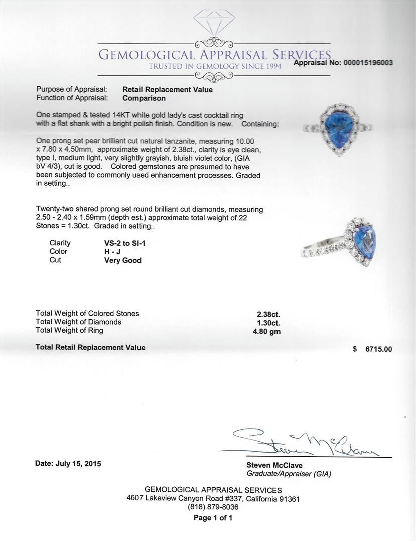 One stamped & tested 14KT white gold lady's cast cocktail ring with a flat shank with a bright polish finish. Condition is new. Containing: One prong set pear brilliant cut natural tanzanite, measuring 10.00 x 7.80 x 4.50mm, approximate weight of 2.38ct., clarity is eye clean, type I, medium light, very slightly grayish, bluish violet color, (GIA bV 4/3), cut is good. Colored gemstones are presumed to have been subjected to commonly used enhancement processes. Graded in setting. Twenty-two shared prong set round brilliant cut diamonds, measuring 2.50 - 2.40 x 1.59mm (depth est.) approximate total weight of 22 Stones = 1.30ct. Graded in setting. Clarity: VS-2 to SI-1. Color: H - J. Cut: Very Good. Total Weight of Colored Stones: 2.38ct. Total Weight of Diamonds: 1.30ct. Total Weight of Ring: 4.80 gm. GAS Appraised at $6,715.00.