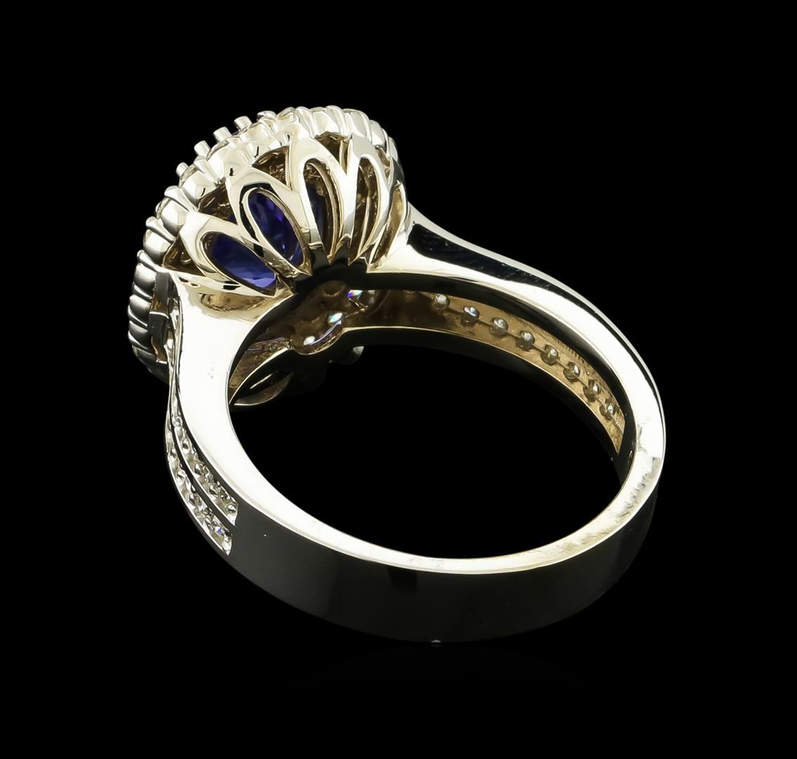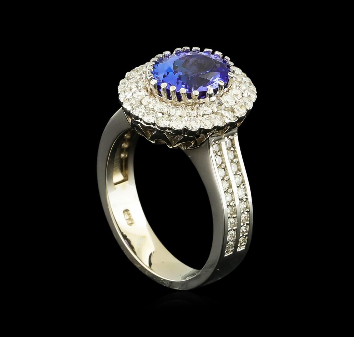 One electronically tested 14KT white gold lady's cast fashion ring with a double basket halo with a bright polish finish. The featured lady's ring has a shank measuring 4.10 millimeters wide. Identified with markings of "K14". Condition is new, good workmanship. Containing: One prong set oval modified brilliant cut natural tanzanite, measuring 9.85 x 7.40 x 4.90mm, approximate weight of 2.39ct., clarity is eye clean, type I, medium, moderately strong, violetish blue color, (GIA vB 5/4), cut is very good. Transmitting light with no distortion, transparent. Colored gemstones are presumed to have been subjected to commonly used enhancement processes. Graded in the setting. Forty-Six prong set round brilliant cut diamonds, measuring 1.60 - 1.50 x 0.96mm (depth est.) approximate total weight of 46 Stones = 0.68ct. Graded in the setting. Clarity: VS-2 to SI-2. Color: H - I. Cut Very Good Thirty-Six prong set round brilliant cut diamonds, measuring 1.30 - 1.20 x 0.78mm (depth est.) approximate total weight of 36 Stones = 0.27ct. Graded in the setting. Clarity: SI-1 to I-1. Color: H - I. Cut Good. Total Weight of Colored Stones 2.39ct. Total Weight of Diamonds 0.95ct. Total Weight of Ring 7.20gm. GAS Appraised at $7,470.00.