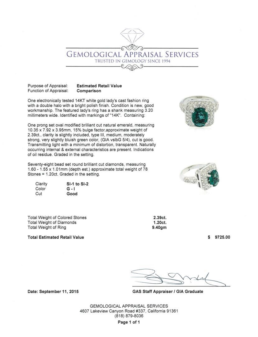 One electronically tested 14KT white gold lady's cast fashion ring with a double halo with a bright polish finish. The featured lady's ring has a shank measuring 3.20 millimeters wide. Identified with markings of "14K". Condition is new, good workmanship. Containing: One prong set oval modified brilliant cut natural emerald, measuring 10.35 x 7.92 x 3.95mm, 15% bulge factor, approximate weight of 2.39ct., clarity is slightly included, type III, medium, moderately strong, very slightly bluish green color, (GIA vslbG 5/4), cut is good. Transmitting light with a minimum of distortion, transparent. Naturally occurring internal & external characteristics are present. Indications of oil residue. Graded in the setting. Seventy-Eight bead set round brilliant cut diamonds, measuring 1.60 - 1.55 x 1.01mm (depth est.) approximate total weight of 78 Stones = 1.20ct. Graded in the setting. Clarity: SI-1 to SI-2. Color: G - I. Cut Good. Total Weight of Colored Stones 2.39ct. Total Weight of Diamonds 1.20ct. Total Weight of Ring 9.40gm. GAS Appraised at $9,725.00.