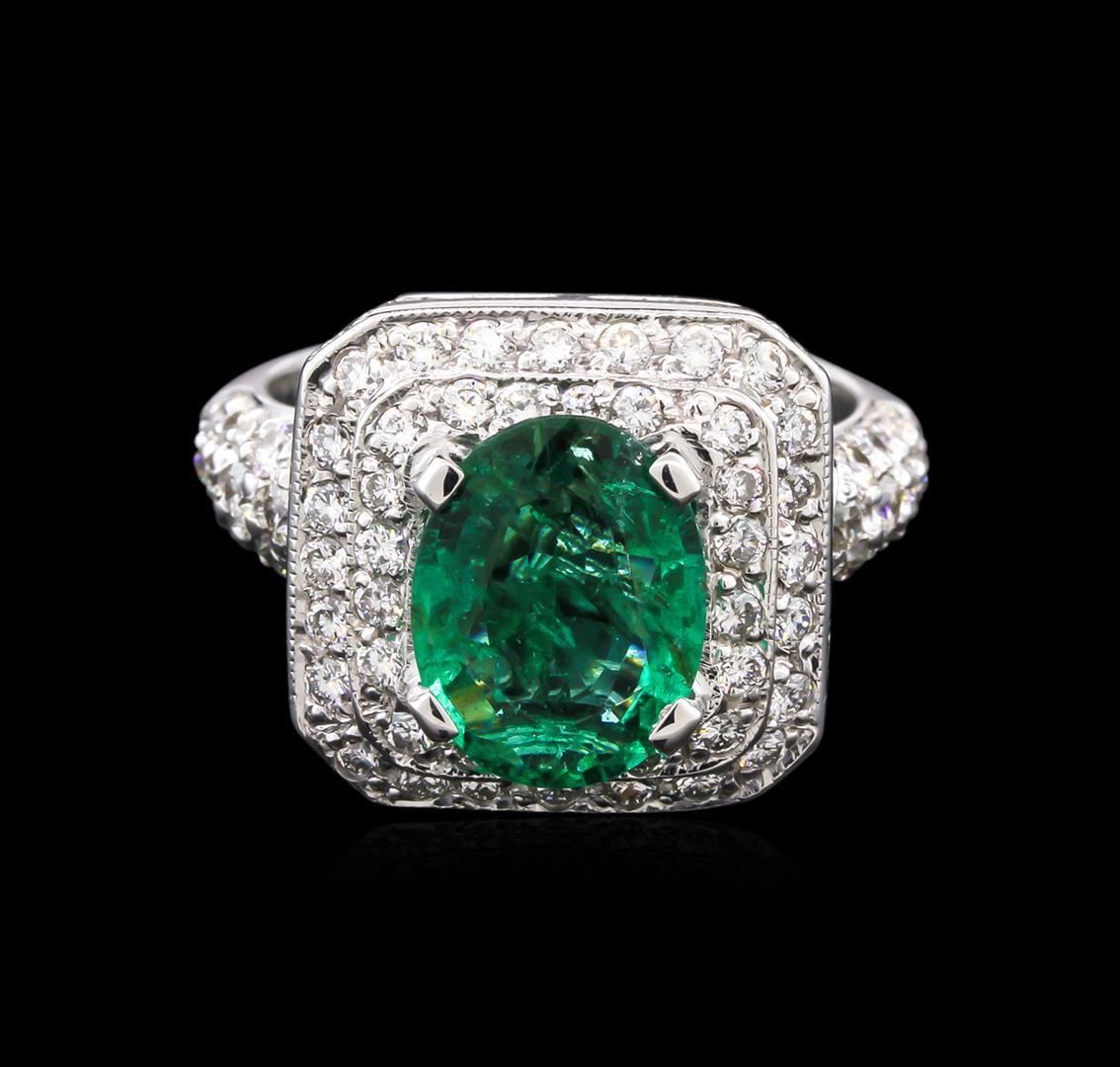 One electronically tested 14KT white gold lady's cast fashion ring with a double halo with a bright polish finish. The featured lady's ring has a shank measuring 3.20 millimeters wide. Identified with markings of "14K". Condition is new, good workmanship. Containing: One prong set oval modified brilliant cut natural emerald, measuring 10.35 x 7.92 x 3.95mm, 15% bulge factor, approximate weight of 2.39ct., clarity is slightly included, type III, medium, moderately strong, very slightly bluish green color, (GIA vslbG 5/4), cut is good. Transmitting light with a minimum of distortion, transparent. Naturally occurring internal & external characteristics are present. Indications of oil residue. Graded in the setting. Seventy-Eight bead set round brilliant cut diamonds, measuring 1.60 - 1.55 x 1.01mm (depth est.) approximate total weight of 78 Stones = 1.20ct. Graded in the setting. Clarity: SI-1 to SI-2. Color: G - I. Cut Good. Total Weight of Colored Stones 2.39ct. Total Weight of Diamonds 1.20ct. Total Weight of Ring 9.40gm. GAS Appraised at $9,725.00.
