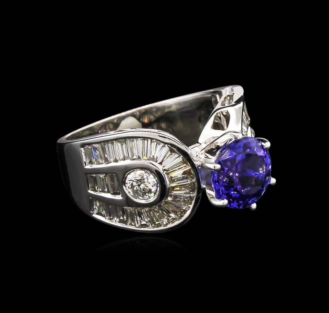One electronically tested 14KT white gold lady's cast fashion ring with a tapered shank with a bright polish finish. The featured lady's ring has a 3.73 millimeter wide shank. Identified with markings of "14K". Condition is new, good workmanship. Containing: One prong set round modified brilliant cut natural tanzanite, measuring 8.08 - 8.00 x 5.50 mm, approximate weight of 2.39ct., clarity is eye clean, type I, dark, moderately strong, violetish blue color, (GIA vB 7/4), cut is good. Transmitting light with no distortion, transparent. Colored gemstones are presumed to have been subjected to commonly used enhancement processes. Graded in the setting. Two bezel set round brilliant cut diamonds, measuring 4.15 - 4.00 x 2.30mm (depth est.) approximate total weight of 2 Stones = 0.50ct. Graded in the setting. Clarity: SI-2. Color: H - I. Cut Good Forty-Eight channel set baguette cut diamonds, measuring from 2.50 x 1.50 x 1.00mm (depth est.) to 3.30 x 2.00 x 1.00mm (depth est.) approximate total weight of 48 Stones = 2.23ct. Graded in the setting. Clarity: VS-2 to SI-1. Color: H - I. Cut Good. Total Weight of Colored Stones 2.39ct. Total Weight of Diamonds 2.73ct. Total Weight of Ring 8.20gm. GAS Appraised at $11,585.00.