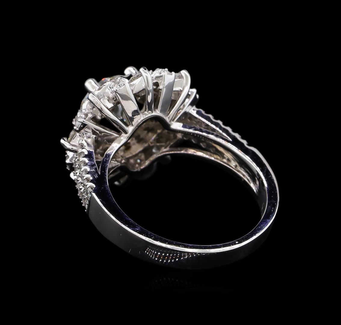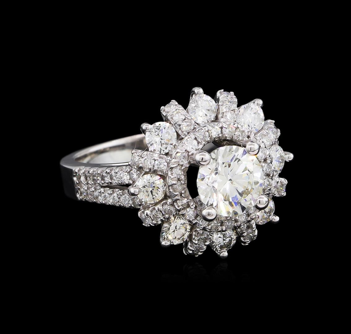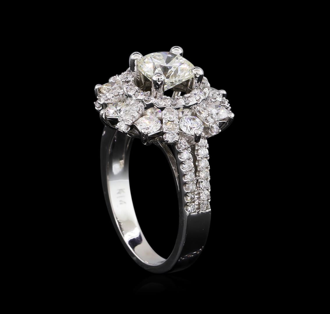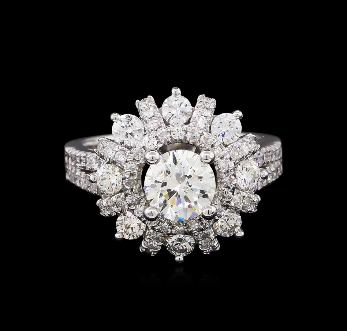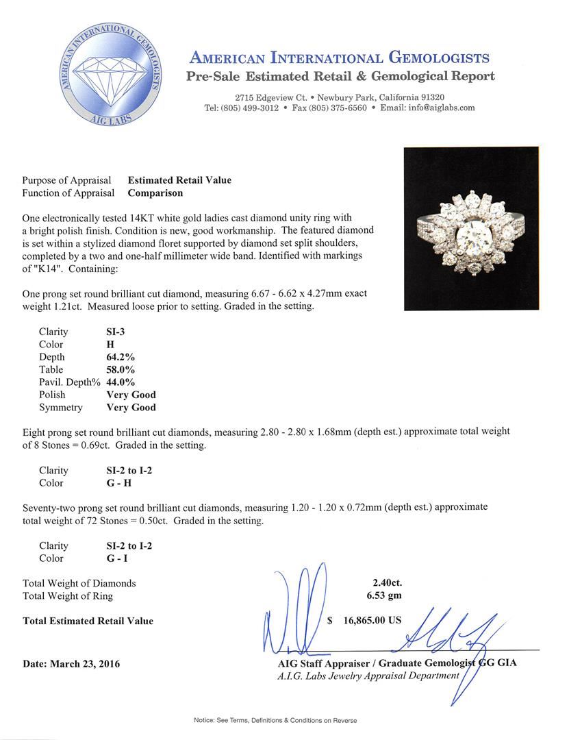 One electronically tested 14KT white gold ladies cast diamond unity ring with a bright polish finish. The featured diamond is set within a stylized diamond floret supported by diamond set split shoulders, completed by a two and one-half millimeter wide band. Identified with markings of "K14". Condition is new, good workmanship. Containing: One prong set round brilliant cut diamond, measuring 6.67 - 6.62 x 4.27mm exact weight 1.21ct. Measured loose prior to setting. Graded in the setting. Clarity: SI-3. Color: H. Depth 64.2%. Table 58.0%. Pavil. Depth%. 44.0%. Eight prong set round brilliant cut diamonds, measuring 2.80 - 2.80 x 1.68mm (depth est.) approximate total weight of 8 Stones = 0.69ct. Graded in the setting. Clarity: SI-2 to I-2. Color: G - H Seventy-Two prong set round brilliant cut diamonds, measuring 1.20 - 1.20 x 0.72mm (depth est.) approximate total weight of 72 Stones = 0.50ct. Graded in the setting. Clarity: SI-2 to I-2. Color: G - I. Total Weight of Diamonds 2.40ct. Total Weight of Ring 6.53gm. AIG Appraised at $16,865.00.