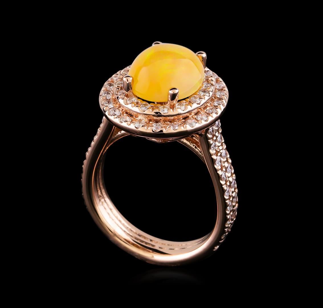 One electronically tested 14KT rose gold lady's cast fashion ring with a double basket halo with a bright polish finish. The featured lady's ring has a double shank measuring 4.06 millimeters in width. Identified with markings of "14K". Condition is new, good workmanship. Containing: One orange crystal that is cut in a oval shaped cabochon and is prong set, measuring 10.80 mm long x 9.08 mm wide, and 7.20 mm thick and the approximate weight is 2.40 carats. The opal has a somewhat bright, orange-red play of color (fire) in a rolling flashfire pattern; a medium dome; a good cut; no inclusions; consistent in its brightness and pattern; and is not directional. Graded in the setting. Seventy-Six prong set round brilliant cut diamonds, measuring 1.50 - 1.40 x 0.87mm (depth est.) approximate total weight of 76 Stones = 0.85ct. Graded in the setting. Clarity: SI-1 to SI-2. Color: G - Good. Total Weight of Diamonds 0.85ct. Total Weight of Opals 2.40 ct. Total Weight of Ring 8.50gm GAS Appraised.