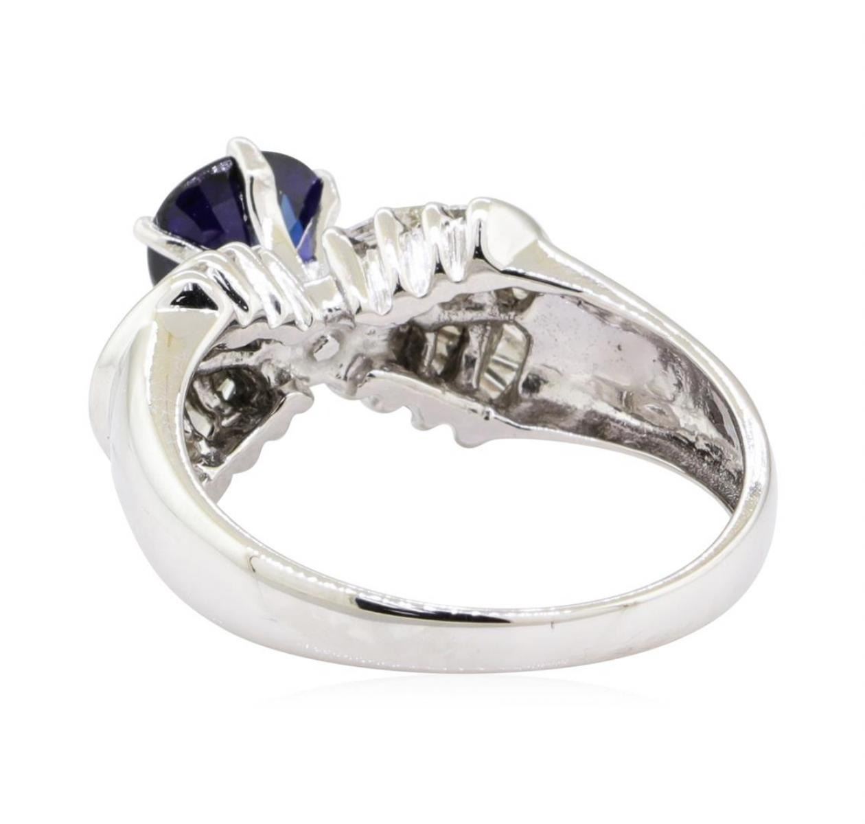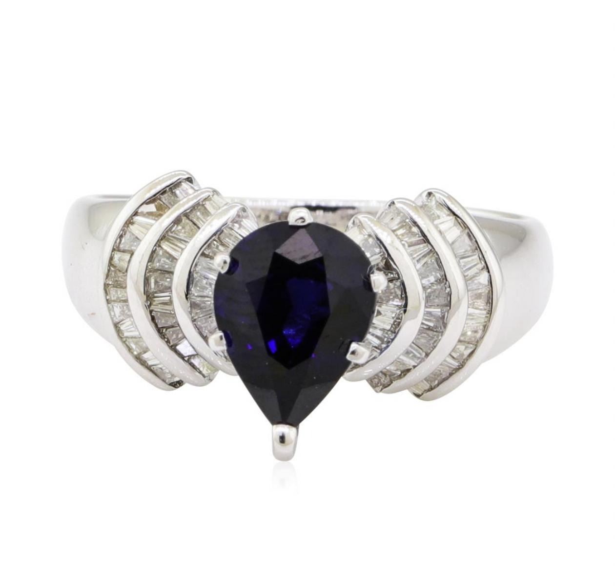One electronically tested 18KT white gold lady's combination cast & assembled fashion ring with a tapered cathedral shank with a bright polish finish. The featured lady's ring has diamond set half dome shoulders and a shank measuring 2.30 millimeters wide. Identified with markings of '18K'. Condition is like new, good workmanship. Containing: One prong set pear modified mixed cut natural blue sapphire, measuring 8.70 x 6.85 x 3.50mm, (depth est.) approximate weight of 1.70 ct., clarity is moderately included, dark, strong, violetish blue color, (GIA vB 7/5), cut is very good. Transmitting light somewhat diffusely, transparent to translucent. Colored gemstones are presumed to have been subjected to commonly used enhancement processes. Graded in the setting. Fifty-Eight channel set baguette cut (tapered) diamonds, measuring from 1.40 x 0.95 x 0.81mm (depth est.) to 1.50 x 1.10 x 0.94mm (depth est.) approximate total weight of 58 Stones = 0.70 ct. Graded in the setting. Color H - J Clarity SI-1 to SI-2 Cut Good. Total Weight of Colored Stones 1.70 ct.. Total Weight of Diamonds 0.70 ct.. Total Weight of Ring 6.10gm GAS Appraised at $4875.00. GAS Appraised.