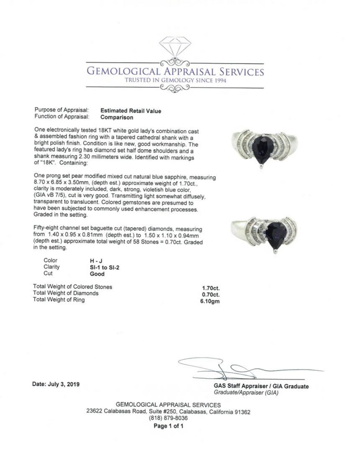 One electronically tested 18KT white gold lady's combination cast & assembled fashion ring with a tapered cathedral shank with a bright polish finish. The featured lady's ring has diamond set half dome shoulders and a shank measuring 2.30 millimeters wide. Identified with markings of '18K'. Condition is like new, good workmanship. Containing: One prong set pear modified mixed cut natural blue sapphire, measuring 8.70 x 6.85 x 3.50mm, (depth est.) approximate weight of 1.70 ct., clarity is moderately included, dark, strong, violetish blue color, (GIA vB 7/5), cut is very good. Transmitting light somewhat diffusely, transparent to translucent. Colored gemstones are presumed to have been subjected to commonly used enhancement processes. Graded in the setting. Fifty-Eight channel set baguette cut (tapered) diamonds, measuring from 1.40 x 0.95 x 0.81mm (depth est.) to 1.50 x 1.10 x 0.94mm (depth est.) approximate total weight of 58 Stones = 0.70 ct. Graded in the setting. Color H - J Clarity SI-1 to SI-2 Cut Good. Total Weight of Colored Stones 1.70 ct.. Total Weight of Diamonds 0.70 ct.. Total Weight of Ring 6.10gm GAS Appraised at $4875.00. GAS Appraised.