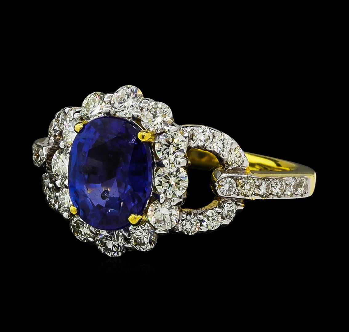 One electronically tested 18KT yellow gold ladies cast sapphire and diamond ring. The featured sapphire is set within a diamond bezel supported by stylized diamond set shoulders, completed by a two millimeter wide band. Bright polish finish with rhodium accents. Identified with markings of '750'. Condition is good. Containing: One prong set oval mixed cut natural blue sapphire, measuring 8.91 x 7.07 x 4.10mm, exact weight 2.40ct., clarity is moderately included, type II, medium dark, very slightly grayish, violetish blue color, (GIA vB 6/3), cut is good. Transmitting light with a minimum of distortion, transparent. Naturally occurring internal & external characteristics are present. No indications of heating. Origin is Myanmar. Asian Institute of Gemological Sciences (AIGS) Report attached. Graded loose in the AIGS Laboratory. AIGS Report # GF16011075. Twelve prong set round brilliant cut diamonds, measuring 2.70 - 2.40 x 1.53mm (depth est.) approximate total weight of 12 Stones = 0.73ct. Graded in the setting. Clarity SI-1 to SI-2. Color: H - J Twenty-Four prong set round brilliant cut diamonds, measuring 1.60 - 1.50 x 0.93mm (depth est.) approximate total weight of 24 Stones = 0.38ct. Brown secondary color throughout. Graded in the setting. Clarity VS-2 to SI-2. Color: H - J. Total Weight of Colored Stones 2.40ct.. Total Weight of Diamonds 1.11ct.. Total Weight of Ring 6.56gm. AIG Appraised at $18,165.00.