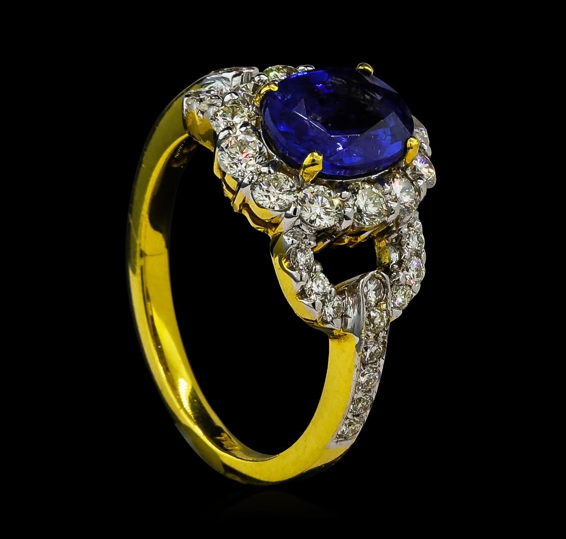 One electronically tested 18KT yellow gold ladies cast sapphire and diamond ring. The featured sapphire is set within a diamond bezel supported by stylized diamond set shoulders, completed by a two millimeter wide band. Bright polish finish with rhodium accents. Identified with markings of '750'. Condition is good. Containing: One prong set oval mixed cut natural blue sapphire, measuring 8.91 x 7.07 x 4.10mm, exact weight 2.40ct., clarity is moderately included, type II, medium dark, very slightly grayish, violetish blue color, (GIA vB 6/3), cut is good. Transmitting light with a minimum of distortion, transparent. Naturally occurring internal & external characteristics are present. No indications of heating. Origin is Myanmar. Asian Institute of Gemological Sciences (AIGS) Report attached. Graded loose in the AIGS Laboratory. AIGS Report # GF16011075. Twelve prong set round brilliant cut diamonds, measuring 2.70 - 2.40 x 1.53mm (depth est.) approximate total weight of 12 Stones = 0.73ct. Graded in the setting. Clarity SI-1 to SI-2. Color: H - J Twenty-Four prong set round brilliant cut diamonds, measuring 1.60 - 1.50 x 0.93mm (depth est.) approximate total weight of 24 Stones = 0.38ct. Brown secondary color throughout. Graded in the setting. Clarity VS-2 to SI-2. Color: H - J. Total Weight of Colored Stones 2.40ct.. Total Weight of Diamonds 1.11ct.. Total Weight of Ring 6.56gm. AIG Appraised at $18,165.00.
