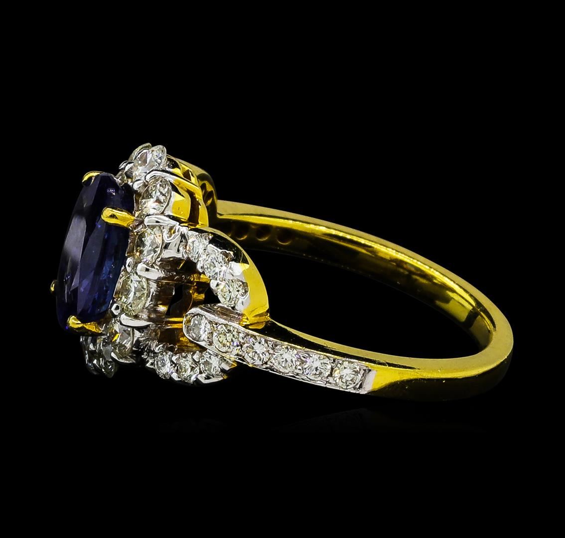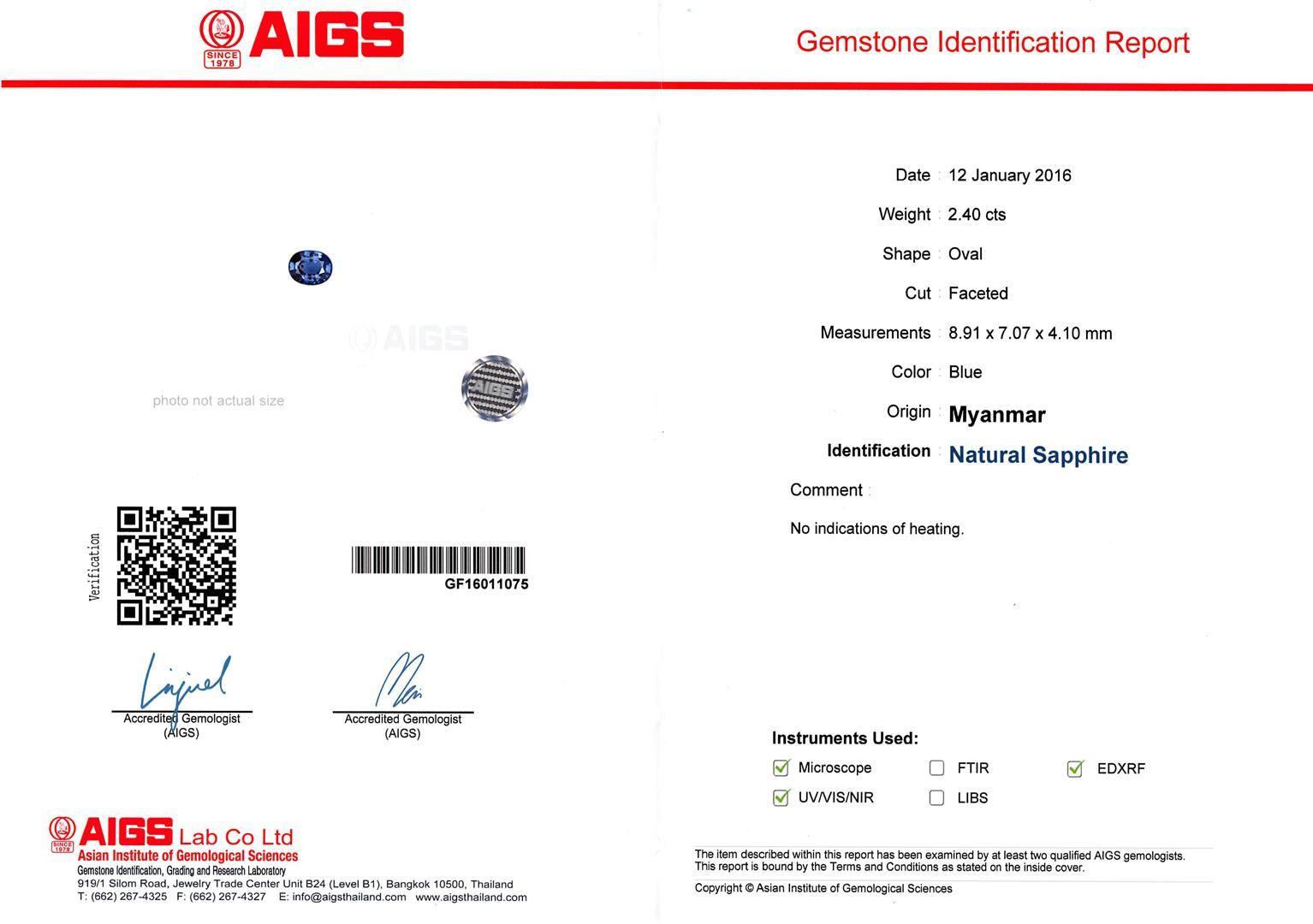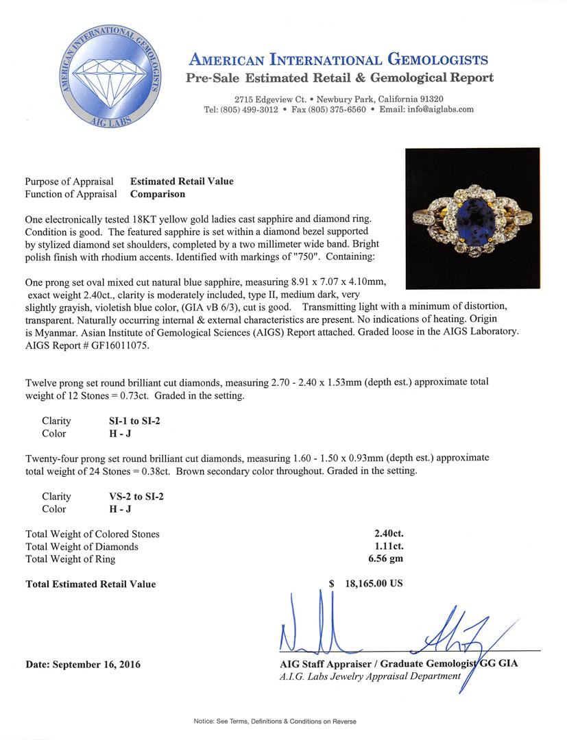 One electronically tested 18KT yellow gold ladies cast sapphire and diamond ring. The featured sapphire is set within a diamond bezel supported by stylized diamond set shoulders, completed by a two millimeter wide band. Bright polish finish with rhodium accents. Identified with markings of '750'. Condition is good. Containing: One prong set oval mixed cut natural blue sapphire, measuring 8.91 x 7.07 x 4.10mm, exact weight 2.40ct., clarity is moderately included, type II, medium dark, very slightly grayish, violetish blue color, (GIA vB 6/3), cut is good. Transmitting light with a minimum of distortion, transparent. Naturally occurring internal & external characteristics are present. No indications of heating. Origin is Myanmar. Asian Institute of Gemological Sciences (AIGS) Report attached. Graded loose in the AIGS Laboratory. AIGS Report # GF16011075. Twelve prong set round brilliant cut diamonds, measuring 2.70 - 2.40 x 1.53mm (depth est.) approximate total weight of 12 Stones = 0.73ct. Graded in the setting. Clarity SI-1 to SI-2. Color: H - J Twenty-Four prong set round brilliant cut diamonds, measuring 1.60 - 1.50 x 0.93mm (depth est.) approximate total weight of 24 Stones = 0.38ct. Brown secondary color throughout. Graded in the setting. Clarity VS-2 to SI-2. Color: H - J. Total Weight of Colored Stones 2.40ct.. Total Weight of Diamonds 1.11ct.. Total Weight of Ring 6.56gm. AIG Appraised at $18,165.00.