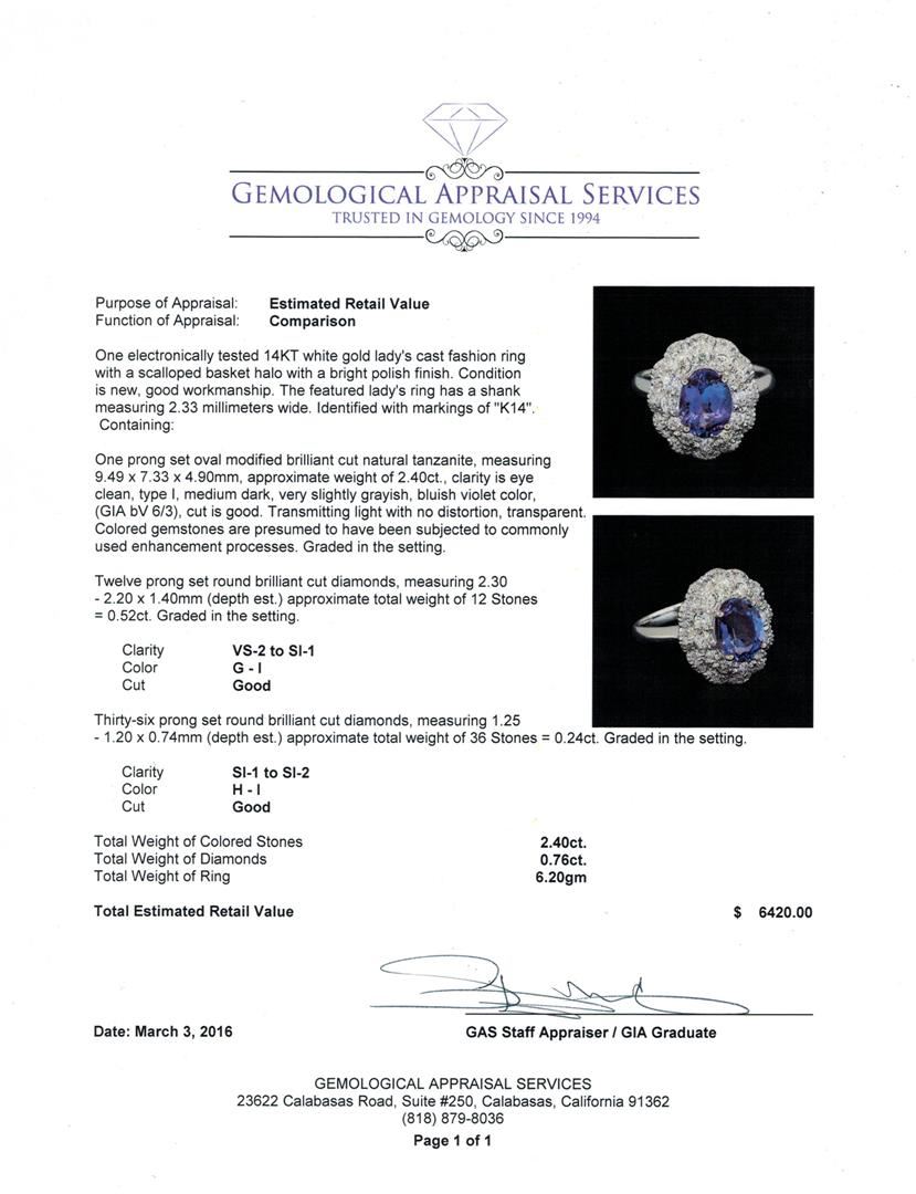One electronically tested 14KT white gold lady's cast fashion ring with a scalloped basket halo with a bright polish finish. The featured lady's ring has a shank measuring 2.33 millimeters wide. Identified with markings of "K14". Condition is new, good workmanship. Containing: One prong set oval modified brilliant cut natural tanzanite, measuring 9.49 x 7.33 x 4.90mm, approximate weight of 2.40ct., clarity is eye clean, type I, medium dark, very slightly grayish, bluish violet color, (GIA bV 6/3), cut is good. Transmitting light with no distortion, transparent. Colored gemstones are presumed to have been subjected to commonly used enhancement processes. Graded in the setting. Twelve prong set round brilliant cut diamonds, measuring 2.30 - 2.20 x 1.40mm (depth est.) approximate total weight of 12 Stones = 0.52ct. Graded in the setting. Clarity: VS-2 to SI-1. Color: G - I. Cut Good Thirty-Six prong set round brilliant cut diamonds, measuring 1.25 - 1.20 x 0.74mm (depth est.) approximate total weight of 36 Stones = 0.24ct. Graded in the setting. Clarity: SI-1 to SI-2. Color: H - I. Cut Good. Total Weight of Colored Stones 2.40ct. Total Weight of Diamonds 0.76ct. Total Weight of Ring 6.20gm. GAS Appraised at $6,420.00.